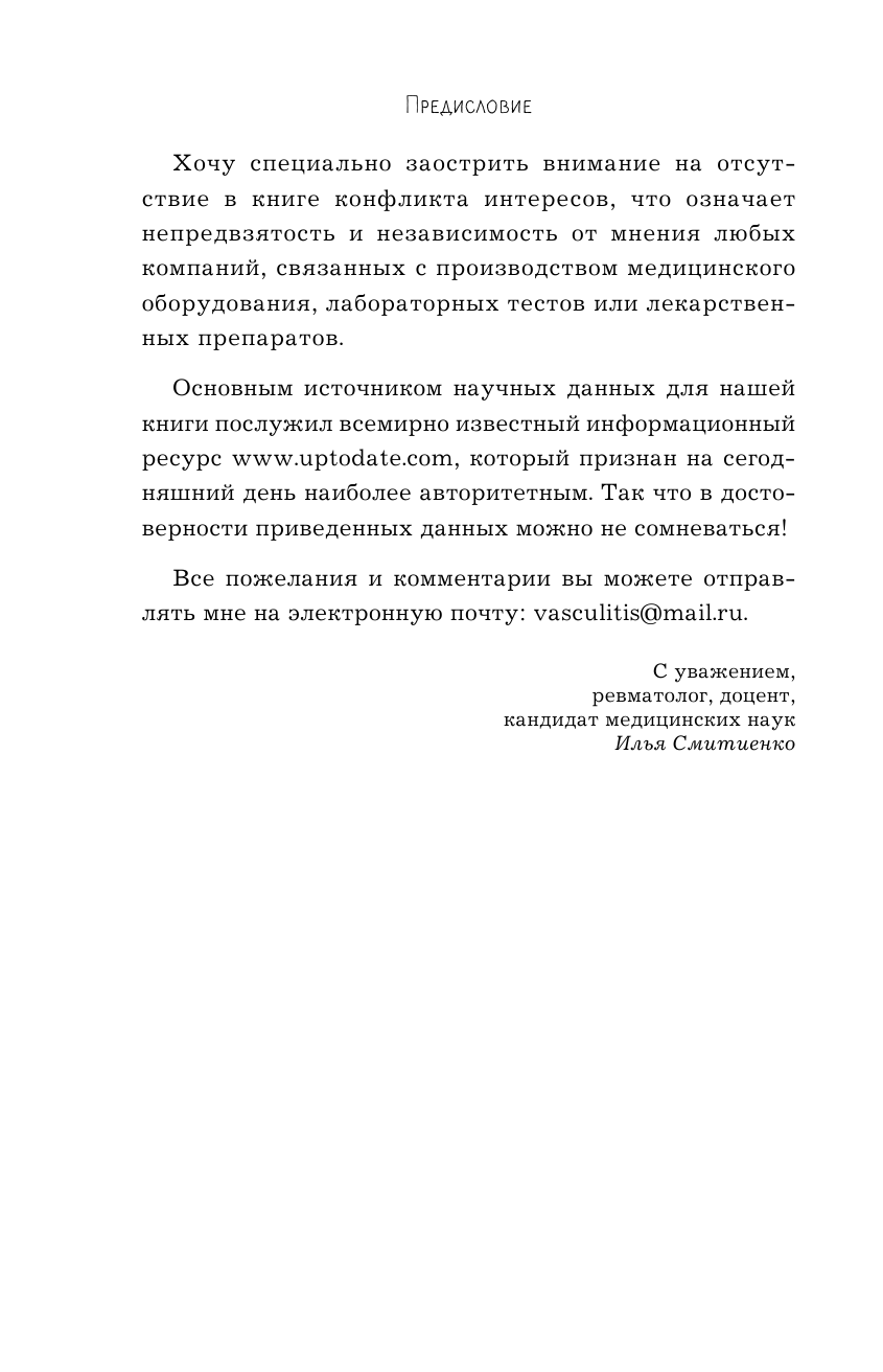 Илья Смитиенко - опытный практикующий врач-ревматолог. Автор простым языком рассказывает о сложном - об аутоимунных заболеваниях. Книга написана для пациентов, но она может быть полезной и для врачей. Автор этой книгой помогает наладить контакт между врачом и пациентом, ведь если последний будет понимать закономерности лечения - дело пойдёт на лад. Я увлекаюсь медициной, книга очень понравилась, ведь эти знания правда могут изменить жизнь.