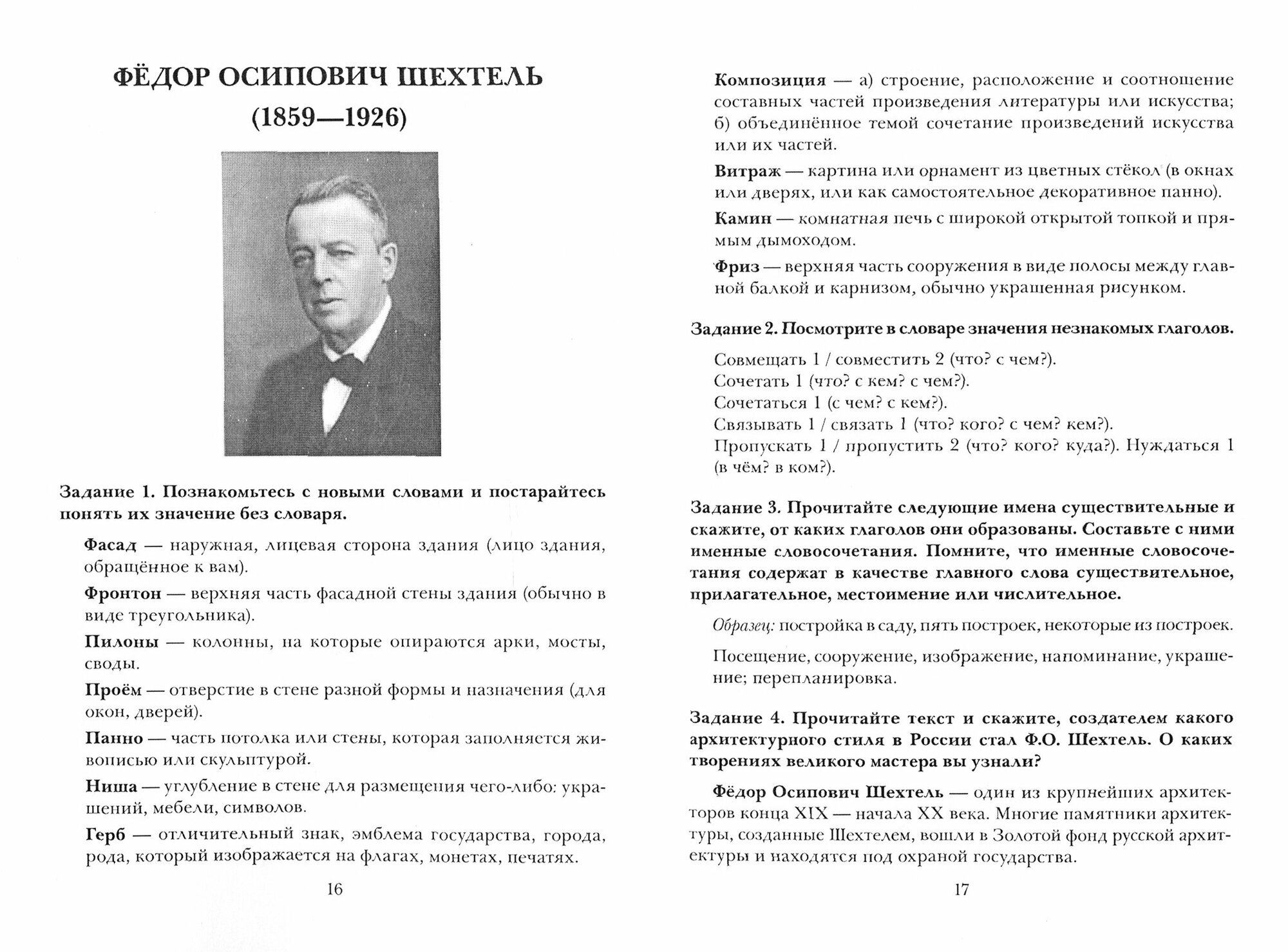 Предлагаемый сборник текстов является дополнительным средством обучения и предназначен для иностранных учащихся, владеющих русским языком в объёме 1-го сертификационного уровня. Целью сборника является формирование навыков и умений речевой деятельности, соответствующих профилю профессии обучающихся. Сборник состоит из семи текстов, которые рассказывают о выдающихся зодчих - В. Шухове, А. Щусеве, А. Душкине, Ф. Шехтеле, О. Бове, М. Казакове, В. Баженове, чья жизнь и творчество связаны с Москвой. К каждому тексту предлагаются разнообразные задания, способствующие лучшему пониманию и усвоению материала.