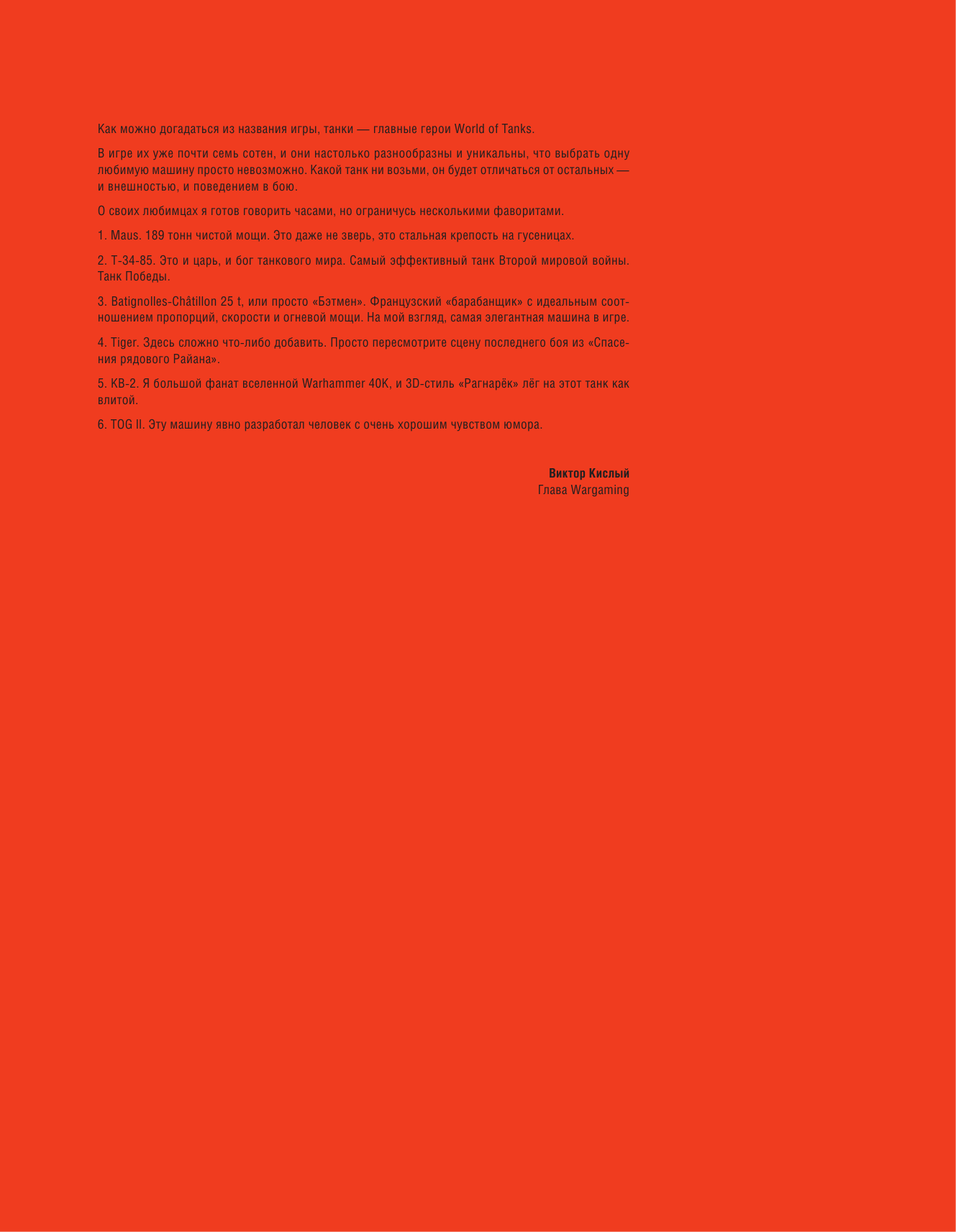 Невероятная книга. Хочется отметить то, что это действительно книга премиум-класса: качество бумаги заслуживает отдельного уважения. Наконец-то собрана вся история игры World of Tanks в одном месте. Порадовало интервью с разработчиками игры, которые делятся уникальной информацией о создании игры и тех вещах, о которых сложно догадаться рядовому игроку. Также в книге огромное количество приятных бонусов. Уже воспользовался парочкой (особенно порадовал премиум-аккаунт на неделю, это было круто!). Рекомендую тем, кто такой же фанат игры, как и я!