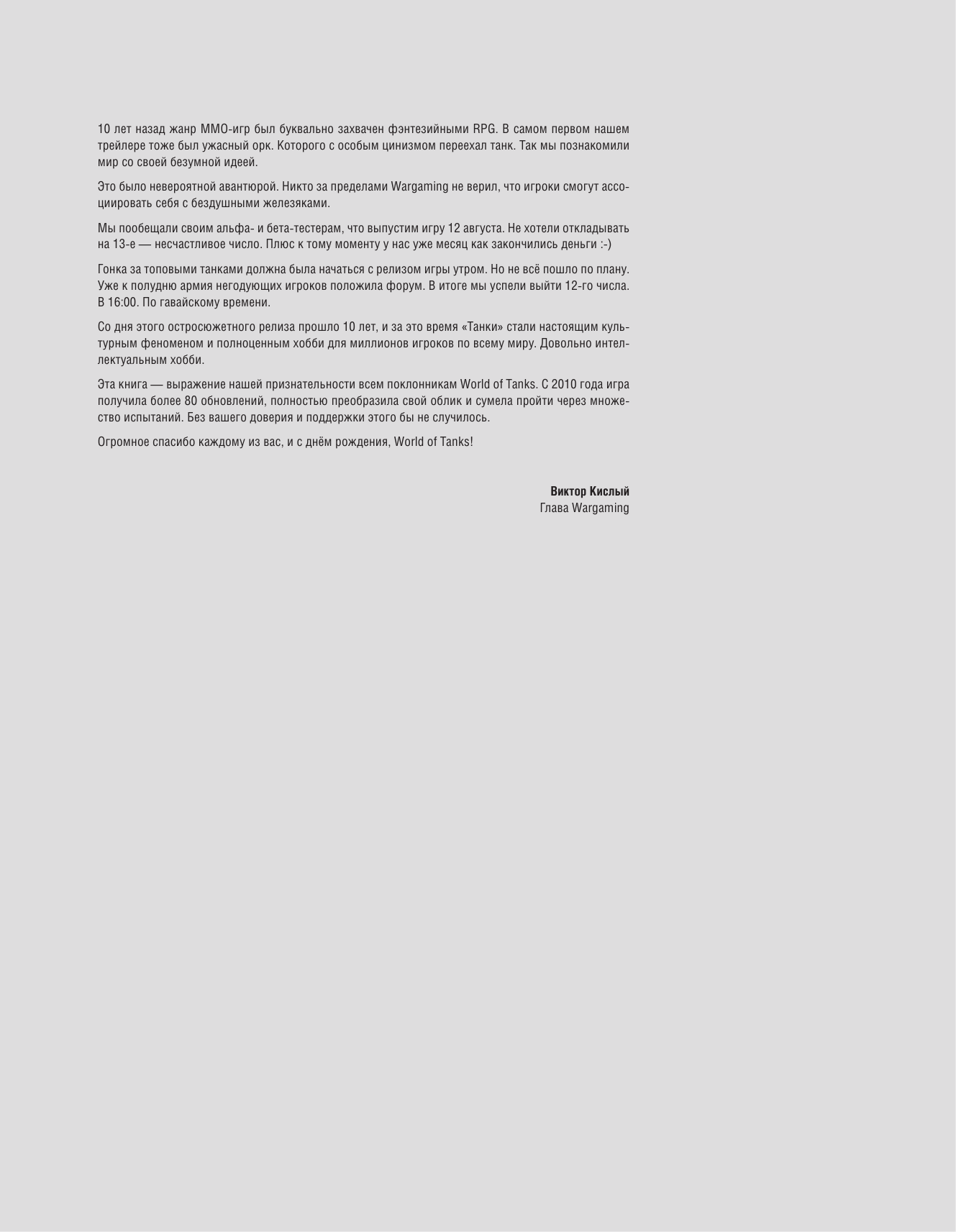 "Эксклюзивный артбук посвящен десятилетней истории World of Tanks. Здесь собрана уникальная информация об игре, о танках, локациях, игровых событиях и многом другом. Великолепные иллюстрации показывают весь путь развития проекта, ставшего настоящим феноменом среди видеоигр.