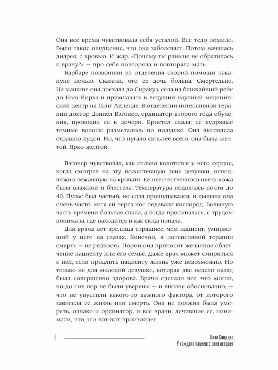 Вполне здоровый молодой человек внезапно теряет память — он не может удержать в голове даже то, что случилось всего час назад. Двое пациентов с болезнью Лайма идут на поправку после лечения антибиотиками, но все симптомы загадочным образом возвращаются. Молодая женщина умирает — кровотечение, спутанное сознание, пожелтевшая кожа, — и никто из докторов не знает, что с ней. Автор и врач описывает, что творится в умах и душах коллег, которые пытаются разрешить новую профессиональную головоломку — и спасти еще одну жизнь.