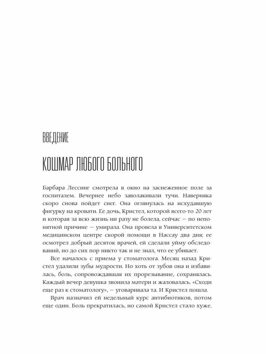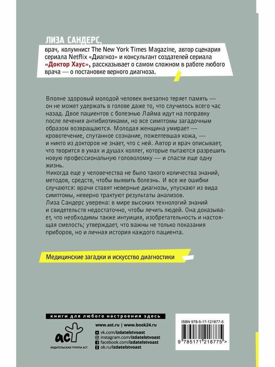 Никогда еще у человечества не было такого количества знаний, методов, средств, чтобы выявить болезнь. И все же ошибки случаются: врачи ставят неверные диагнозы, упускают из вида симптомы, неверно трактуют результаты анализов. Лиза Сандерс уверена: в мире высоких технологий знания и свидетельств недостаточно, чтобы лечить людей. Она доказывает, что необходимы также интуиция, изобретательность и настоящая смелость; утверждает, что важные не только показания приборов, но и личная история каждого пациента.