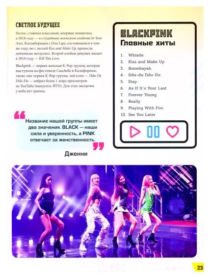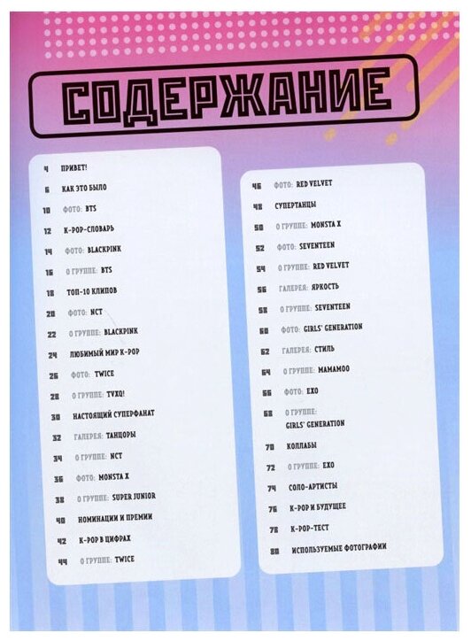 Издание, наполненное яркими фотографиями, перенесет тебя в мир песен, стиля и занятных историй о твоих любимых K-Pop-группах и сольных артистах. Среди них — BTS, Blackpink, Twice, EXO и многие другие. Ты станешь свидетелем того, как обычные стажеры превращаются в айдолов, оценишь лучшие музыкальные клипы и проверишь свои знания корейского языка!