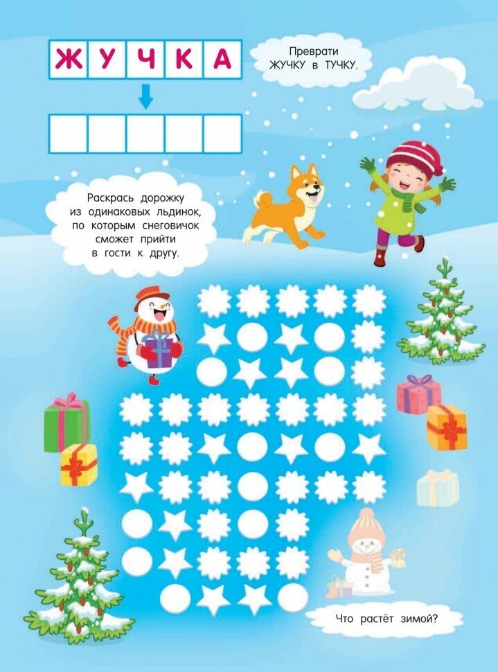 Книга интересная, яркая и красочная многостраничная, много заданий. Много заданий связанных с буквами и словами, для детей умеющих читать. Но так же есть задания и попроще: лабиринты, тени,картинкии ,найди отличия т.д. На возврат от 4 лет примерно. Но с малышами тоже частично можно пройти.