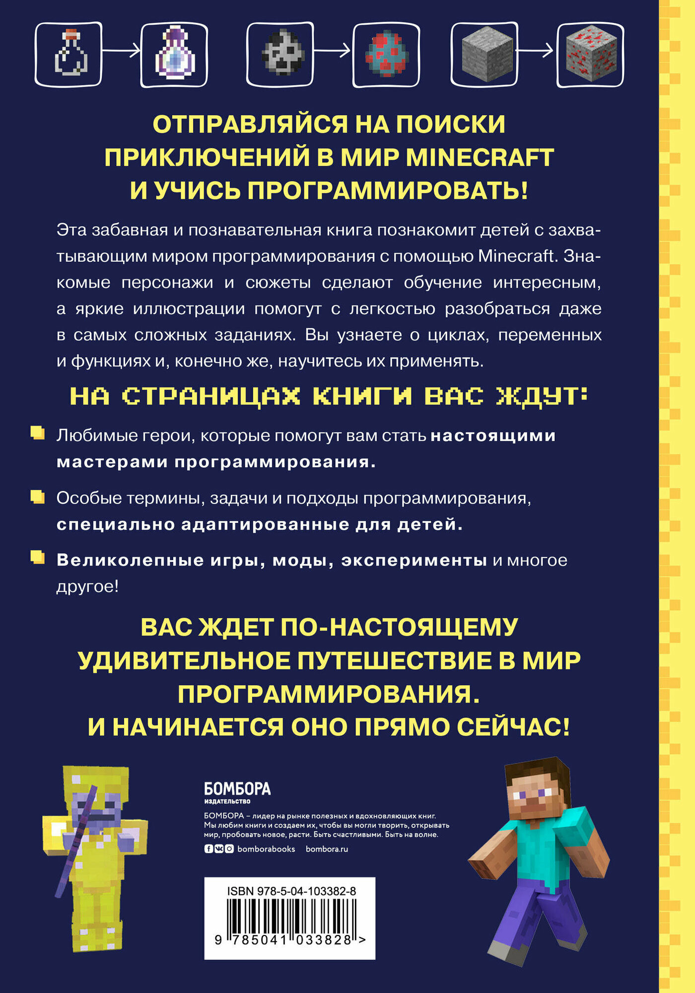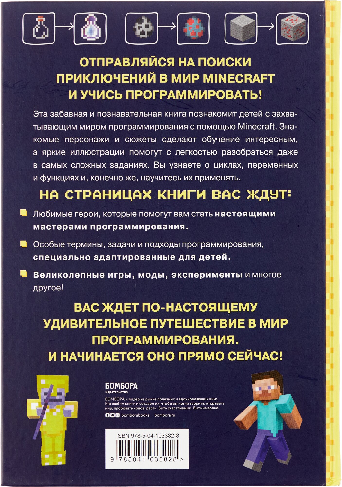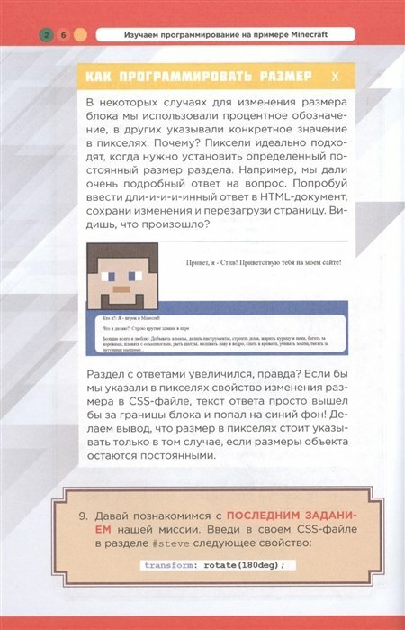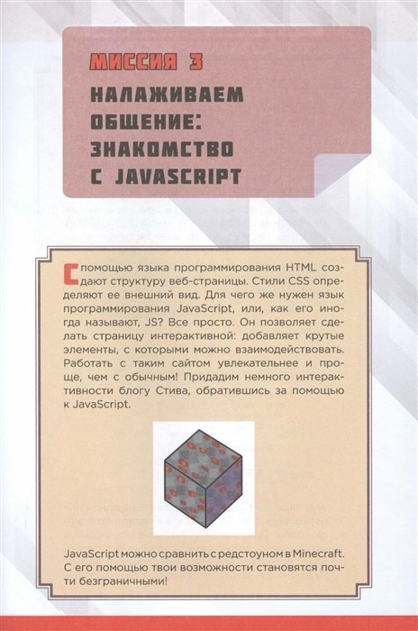 Эта забавная и познавательная книга познакомит детей с захватывающим миром программирования с помощью их любимой игры Minecraft. Знакомые персонажи и сюжеты сделают обучение интересным, а яркие иллюстрации помогут с легкостью разобраться даже в самых сложных заданиях. Вы узнаете о циклах, переменных и функциях, и конечно же научитесь их применять. Каждый ребенок найдет что-то интересное для себя – будь то создание сайта Стива или анимация крипера. Вас ждет по-настоящему удивительное путешествие в мир программирования. И начинается оно прямо сейчас!