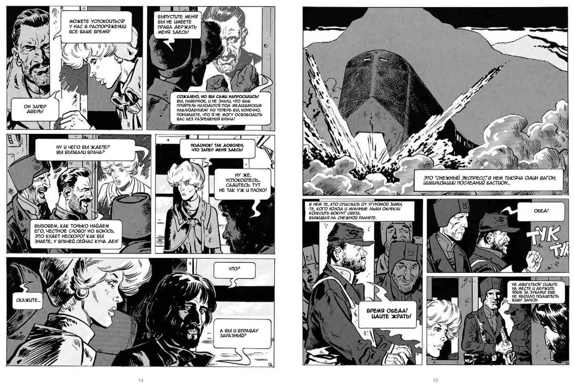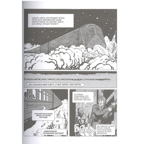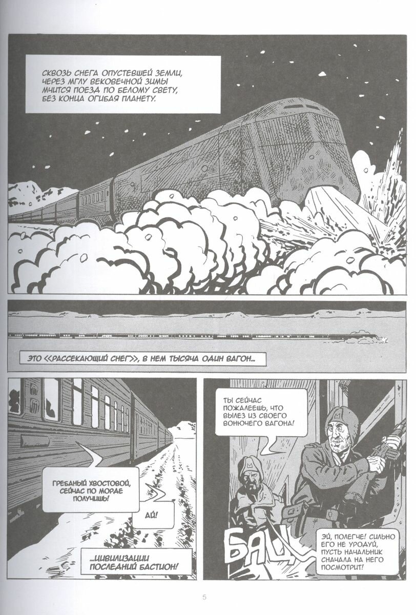 Издание включает графический роман Жака Лоба «Сквозь снег» (1982) и продолжающие повествование о жизни в поезде комиксы «Странник» (1999) и «Переправа» (2000), написанные Бенжамином Леграном. Художник всей серии — Жан-Марк Рошетт.
