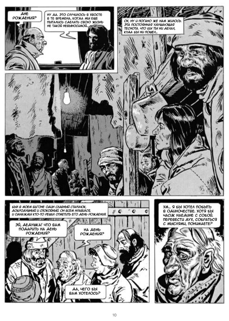 Знаменитый французский комикс, уже дважды экранизируемый (фильм и сериал), наконец-то вышел в России, причём с двумя продолжениями и дополнениями, так что книжка вышла очень толстая - две с половиной сотни страниц вместо привычных для BD 60-ти или 120-ти. Формат книги, правда, меньше - не альбомный (размером с "Инкал"). Лоб написал потрясающую постапокалиптическую историю с социальным подтекстом. Изящная завязка и, казалось бы, простой сюжет заставляют задуматься, переживать за персонажей и с интересом двигаться к неожиданному, хоть и логичному финалу. Прекрасный чёрно-белый рисунок Рошетта передаёт всю гнетущую атмосферу нарратива. Продолжения от Леграна ("Странник" и "Переправа") рассказывают о другом поезде, других героях, и, хотя принцип вроде бы тот же, это немного другая история с новыми персонажами, которая чуть больше открывает мир вокруг поезда. В дополнениях есть обширное послесловие и работы Рошетта, сделанные при работе над фильмом-экранизацией. В общем, книга прекрасна во всём - это настоящая классика, которая должна стоять у каждого ценителя комиксов.
