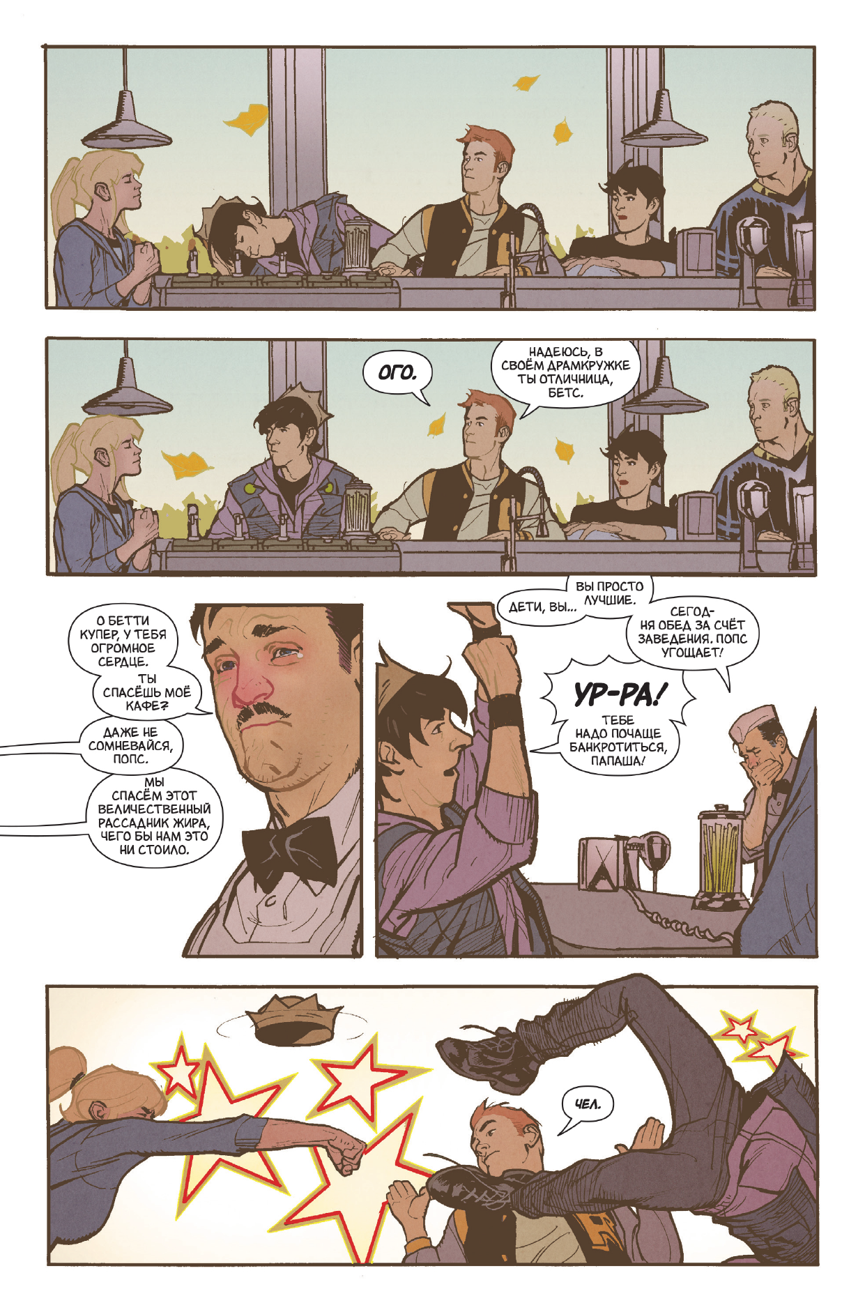 Хипстеры, собака-рассказчик, остроты Джагхеда и рисунок Адама Хьюза. Всё это выглядит как-то сумбурно, но на деле нас ждёт старая история противостояния дух сильных и независимых женщин Бетти и Вероники на фоне новости о закрытии кафе "У Попса". Простые американцы против больших корпораций. Три выпуска пролистываются очень быстро и легко, в этом Арчи остался прежним. В конце галерея альтернативных обложек.
