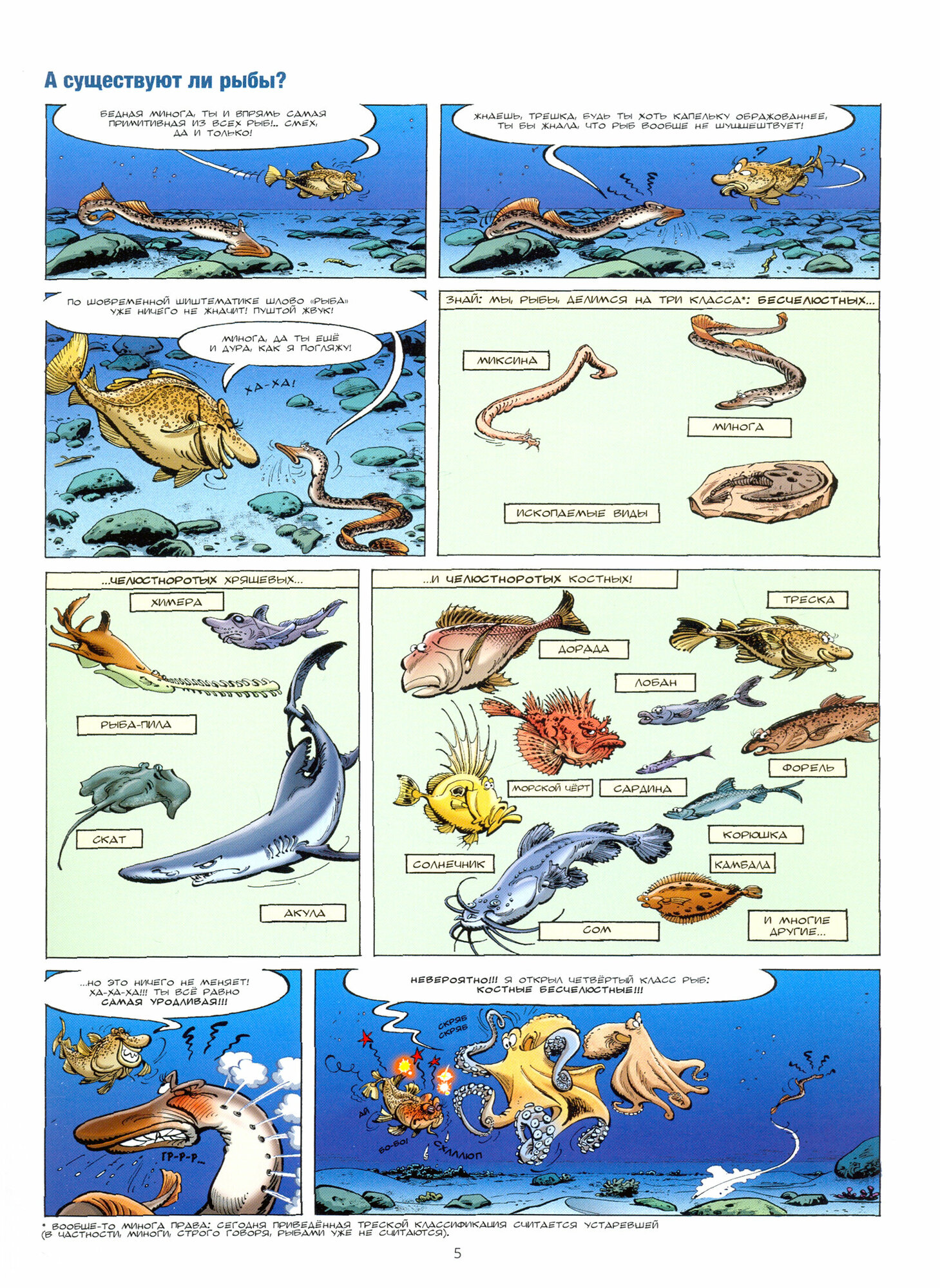 Однако те, кто успел полюбить серию не только за научную достоверность и тщательный подбор информации, но и за искромётный юмор, также не останутся разочарованы; чего стоят истории про дель- фина-кулинара или краба-фантома, хитрого рачка эвридику прекрасную или Мина-долгожителя, непробиваемого хитона или незабываемого кальмара-светлячка... И - вишенка на торте! - ответ на вопрос, который звучит, прямо скажем, несколько неожиданно: а существуют ли вообще рыбы? У кого как, а у миноги на этот счёт своё мнение...