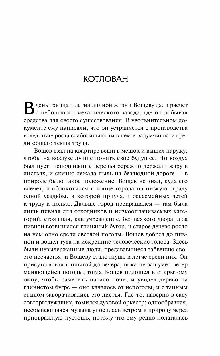 Очень атмосферный получился сборник. По-моему субъективному мнению, здесь собраны наиболее показательные произведения Платонова, раскрывающие его именно как писателя социальных антиутопий изнутри страны советов с его необычным видением жанра и специфичным языком, на котором нормальные люди, как оказалось, не разговаривают. При этом подборка произведений делает это не однобоко, когда рождается ложное ощущение диссидентства Платонова, а показывает именно его искренний тяжёлый поиск счастья в мире социализма через специфическое художественное представление. Сравнивал начало текста «Котлована» с академическим изданием (Наука, 2000 г.) никаких различий не нашёл. К сожалению, издатель не указала источник текста, а это очень важно для таких произведений, где наравне с сюжетом средством выражения мысли является и язык. Бумага - самая простая газета, но шрифт очень приятен для чтения.