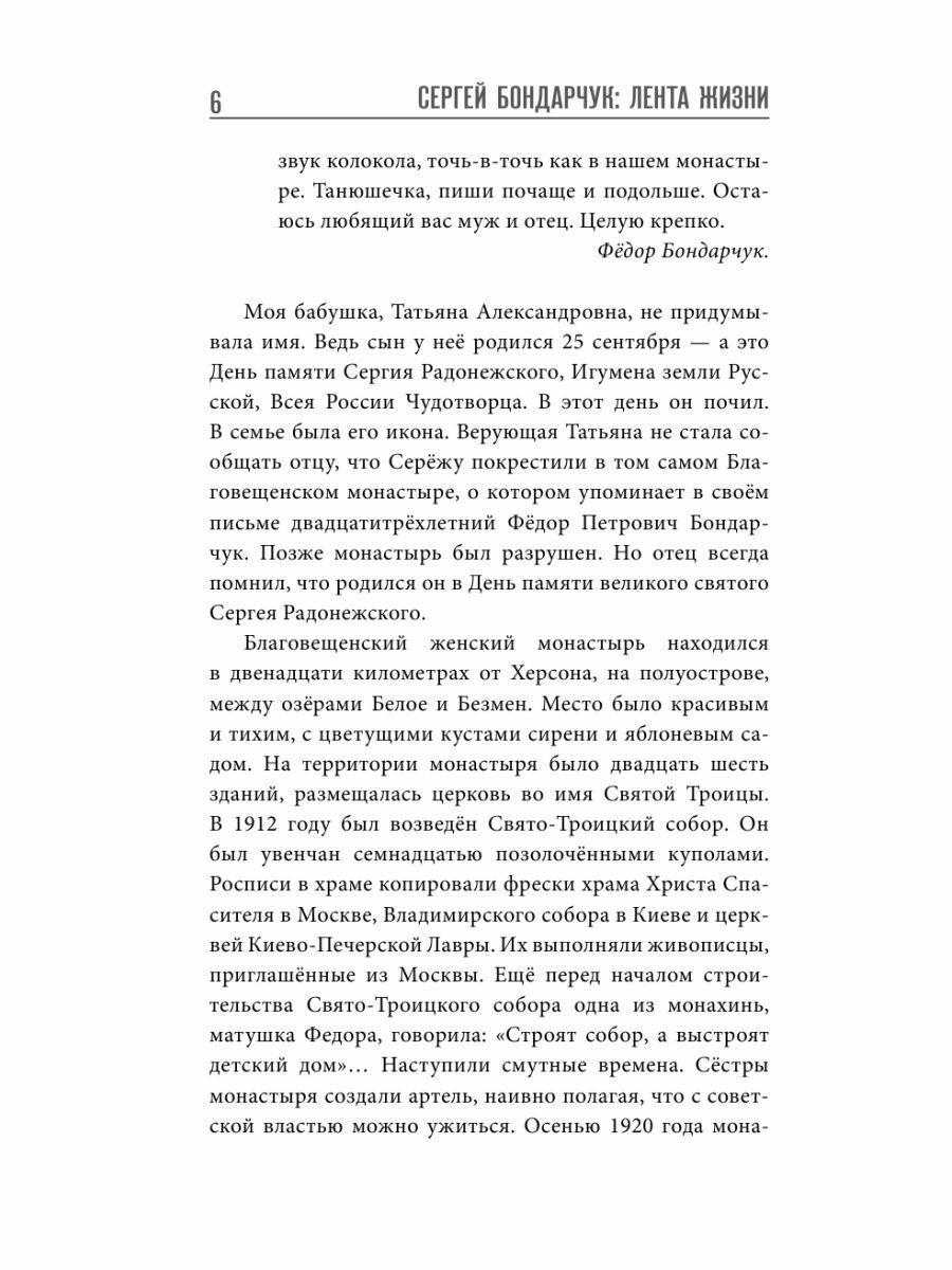 Книга написана его дочерью, известным режиссёром, актрисой и сценаристом Натальей Бондарчук. Перед читателем проходят детские и юношеские годы её отца, время, когда произошло его творческое становление, возникла любовь к театру и кинематографу, которой он остался верен до конца жизни.