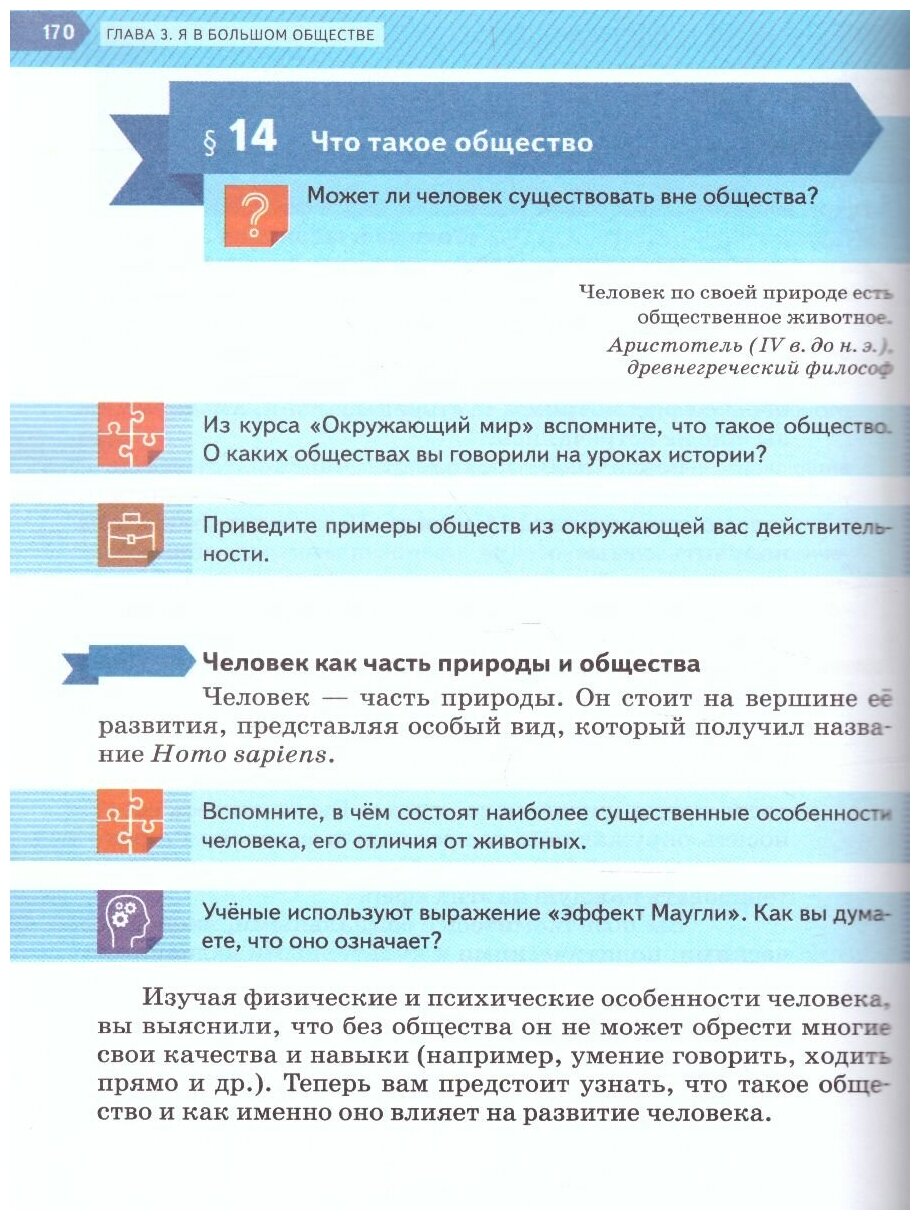 Учебник открывает курс обществознания основной школы. Содержит обширный теоретический и фактический материал о человеке и его ближайшем социальном окружении, об обществе как развивающейся целостности. Методический аппарат предлагает разноуровневые вопросы и задания для индивидуальной и коллективной работы, учит работать с информацией. Схемы и иллюстрации помогут лучше усвоить содержание, а специальные правила (памятки) - правильно организовать работу. Особая роль отводится урокам-практикумам, позволяющим применить полученные знания к жизни.