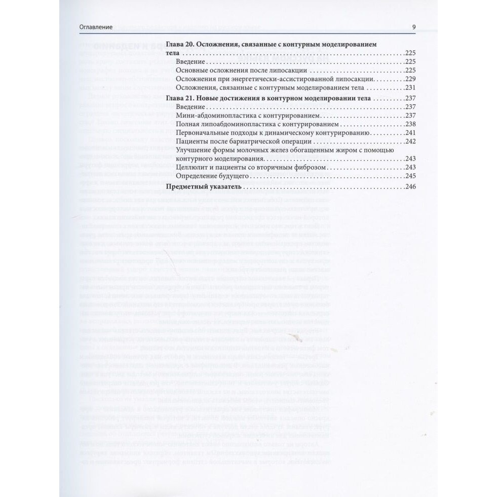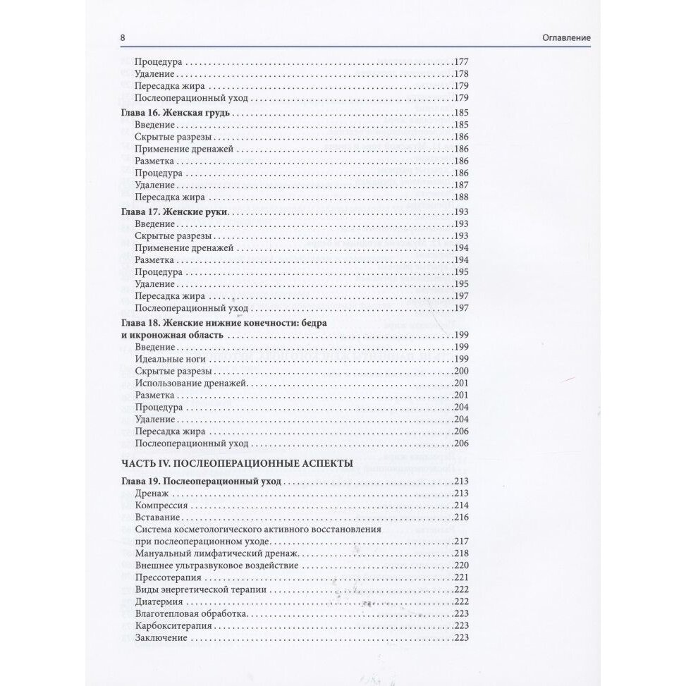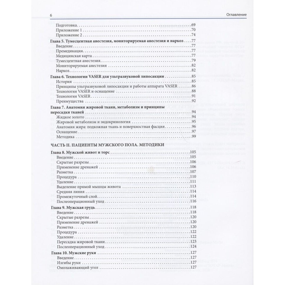Руководство подробно описывает передовые методы липопластики и аутологичной жировой трансплантации для высокоточного моделирования тела. Четкие пошаговые объяснения техник сопровождаются многочисленными цветными иллюстрациями и фотографиями. Первая часть книги содержит главы, посвященные поверхностной и мышечной анатомии, анестезии, оценке тела, технологиям ультразвуковой липопластики и послеоперационному уходу. Затем подробно описано точное моделирование мужского и женского живота, туловища, спины, грудной клетки, верхних и нижних конечностей, а также дана четкая инструкция по аутологичной жировой пластике контурирования ягодиц, груди и грудных областей.