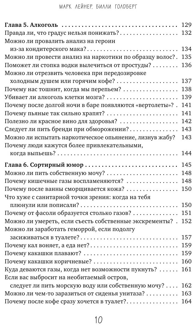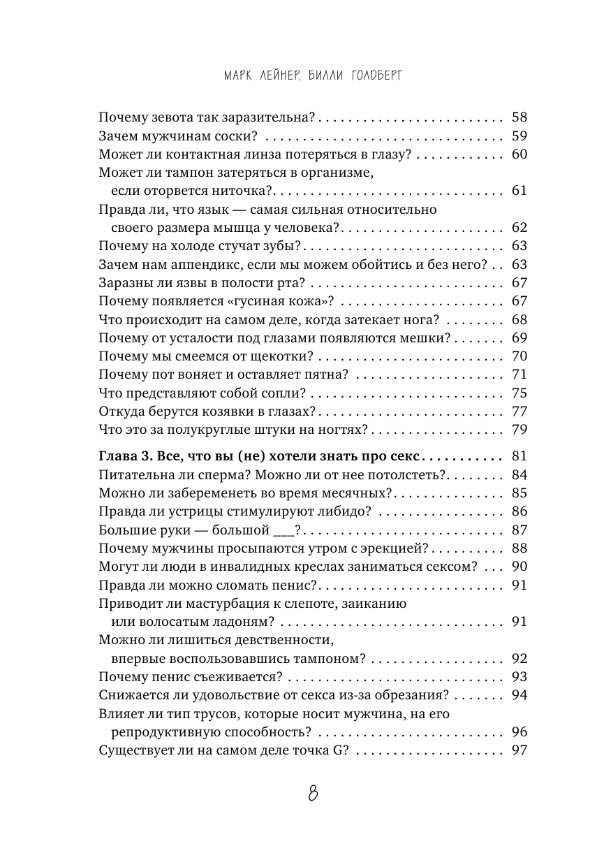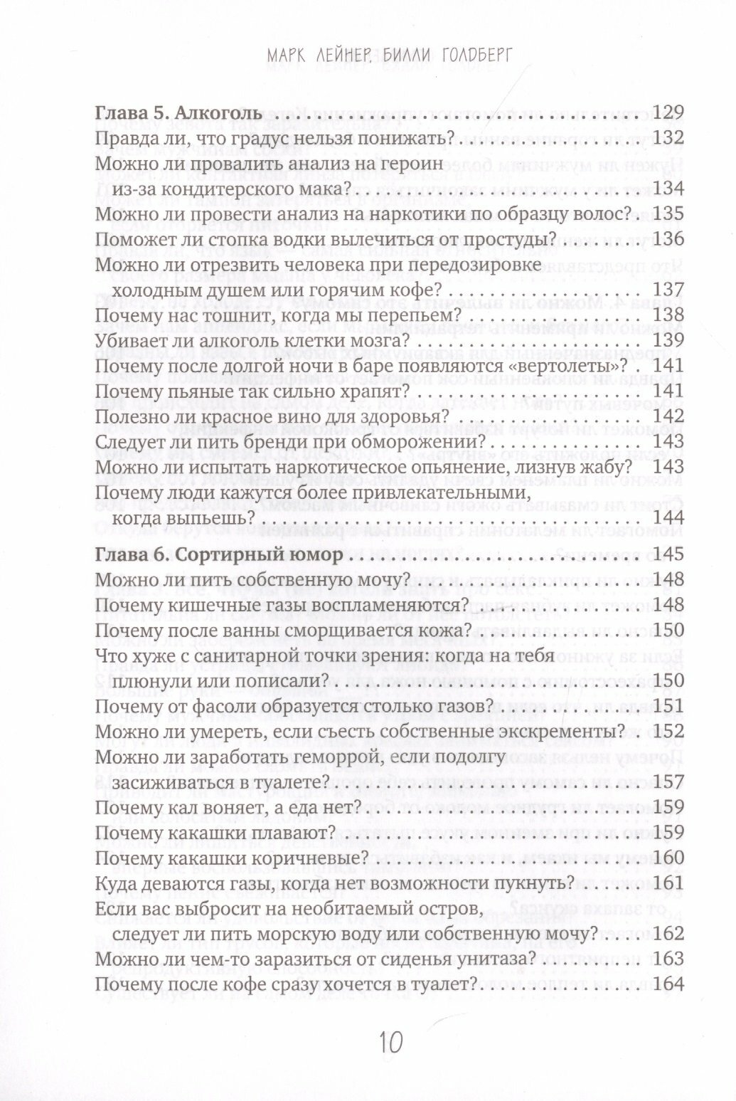 Странная, но прикольная книжка, этакая почемучка для взрослых, как написано на обложке. В ней действительно собрано множество вопросов, причем здесь на сайте приведены даже не самые шокирующие) Книга разделена на 9 глав, каждая из которых посвящена определенной сфере жизни или здоровья: еде и привычкам питания, странностям тела, сексу, заболеваниям и тд. Авторы явно развлекались в процессе написания, и кстати, в книгу включены их переписки времени работы - это было неожиданно, но тоже стало такой изюминкой. Вообще их голоса слышны отчетливо, и отвечают на вопросы они с юмором и отсылками к попкультуре (как оказалось, знаю я довольно мало). Иногда напоминает мои собственные переписки с друзьями. где Остапа понесло.