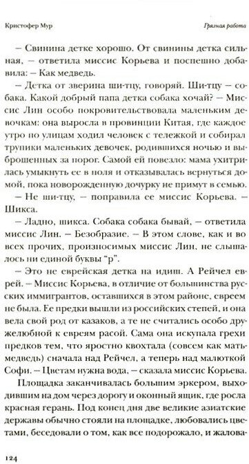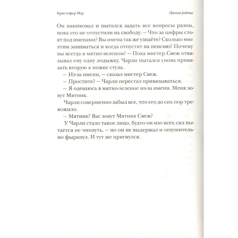 Я влюбилась в эту книгу! Влюбилась в её героев, бета-самца Чарли Ашера, малютку Софи, от одного слова "киска" которое она произносит, преждевременно умирают питомцы и которые охраняют псы из преисподней, кучу самых миксовых и очень колоритных персонажей, ну а главное, в сумасшедшее ч/ю К.Мура, я смеялась в голос. На 40 стр. "Грязной работы" я поняла, что уже захочу продолжения и заказала 2 часть "Подержанные души". Эта книга для тех, кто не сноб и не зануда, не брезгует чёрным юмором, кого не коробит адекватный мат, кто любит странные, непредсказуемые истории с добрым посылом. И если вам нравится Гейман, то Мур понравится тоже) отдельный восторг - это обложка софт тач, тактильно приятная и красочная. В книге для меня было прекрасно всё, я её "проглотила" за пару дней и безумно рада, что познакомилась с новым для меня Кристофером Муром.