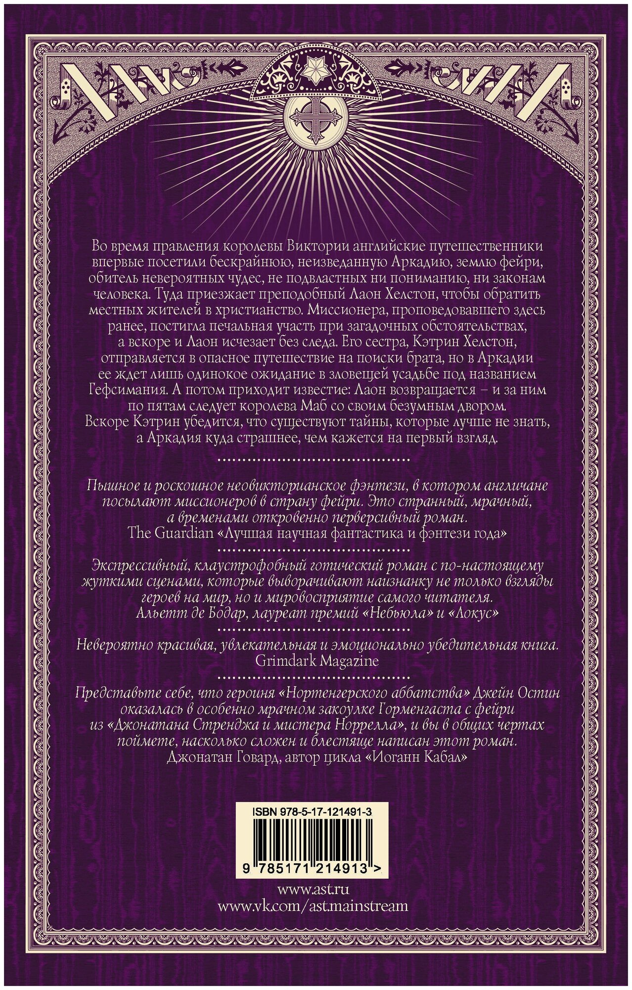 Во время правления королевы Виктории английские путешественники впервые посетили бескрайнюю, неизведанную Аркадию, землю фейри, обитель невероятных чудес, не подвластных ни пониманию, ни законам человека. Туда приезжает преподобный Лаон Хелстон, чтобы обратить местных жителей в христианство. Миссионера, проповедовавшего здесь ранее, постигла печальная участь при загадочных обстоятельствах, а вскоре и Лаон исчезает без следа. Его сестра, Кэтрин Хелстон, отправляется в опасное путешествие на поиски брата, но в Аркадии ее ждет лишь одинокое ожидание в зловещей усадьбе под названием Гефсимания. А потом приходит известие: Лаон возвращается – и за ним по пятам следует королева Маб со своим безумным двором. Вскоре Кэтрин убедится, что существуют тайны, которые лучше не знать, а Аркадия куда страшнее, чем кажется на первый взгляд.