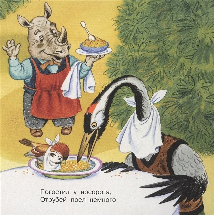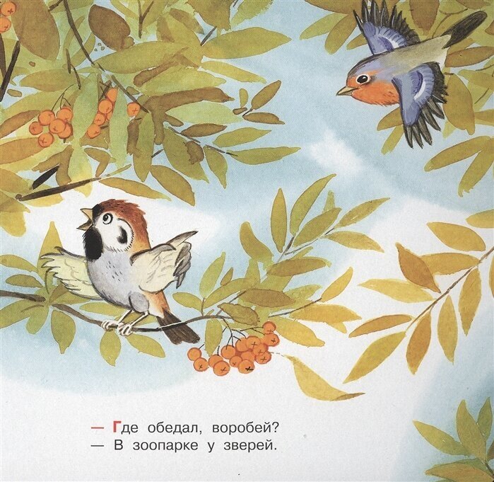 Книжка квадратной формы, очень маленького формата, но при этом достаточно крепкая, с картонным переплетом. Иллюстрации очень яркие и насыщенные, даже слишком, я бы сказала. Они есть буквально на каждой страничке, на весь лист. Текста примерно по две строки на страницу. В данном издании, как можно понять из названия, представлено только одно стихотворение С. Маршака - "Где обедал воробей"