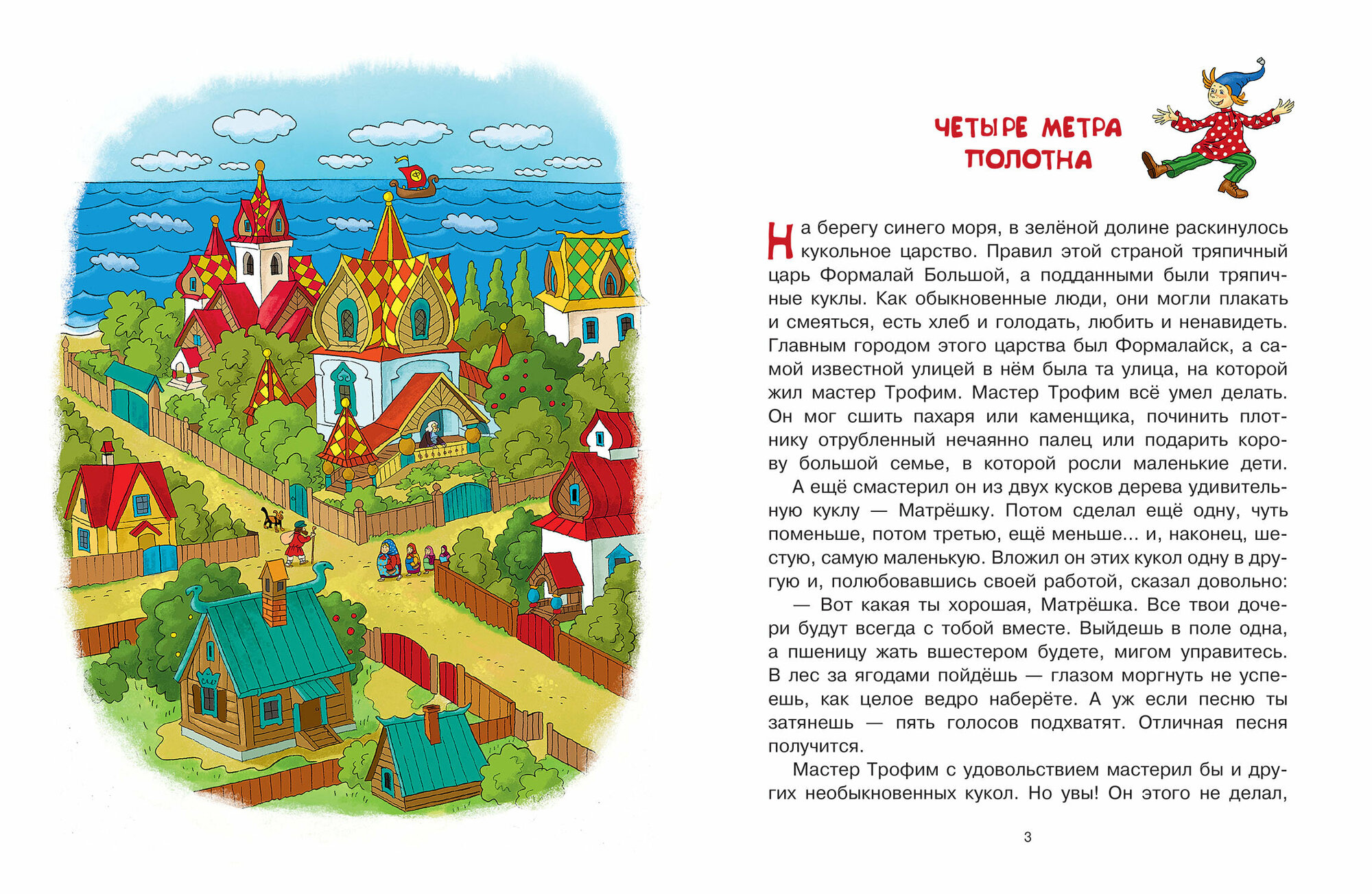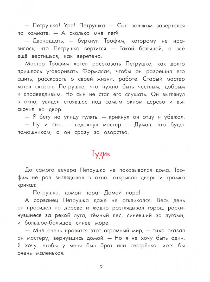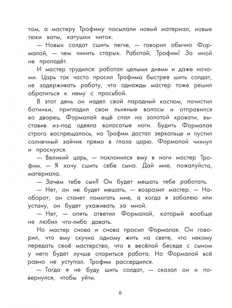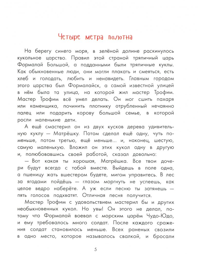 История о городе Формалайске, где живут тряпичные куклы. Управляет городом царь Формалай, который любит только воевать, ради наживы, и совсем не заботясь о простых жителях государства. И конечно же, приходит на помощь простым жителям смелый, честный герой - Петрушка. Книга о борьбе добра и зла, о ценностях, дружбе, самоотверженности. Текст рассчитан на младший школьный возраст. Читать лучше с детьми постарше. Книга достаточно объёмная, на мой взгляд, идеально для прочтения с детьми в 9-10 лет. -