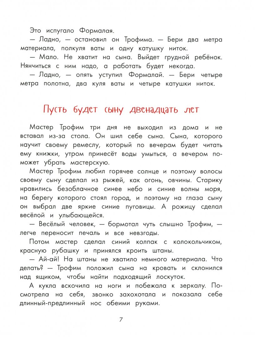 Что касается содержания его подробно можно прочитать в описании на сайте. Со своей стороны, добавлю, что ребенку 7 лет сказка понравилась, читали с удовольствием каждый день, пока она не закончилась))) А вот меня лично местами не покидало ощущение, что читаю очерки бывшего пластического хирурга (ха-ха): один из главных героев – мастер Трофим, он делает кукол и чинит их. Вот например, отрывок: «…он зашил судье оба рта и прорезал новый рот, на спине. Как я буду говорить? Прошамкал рот на спине, сделай мне рот на прежнем месте! Я буду хорошим.»