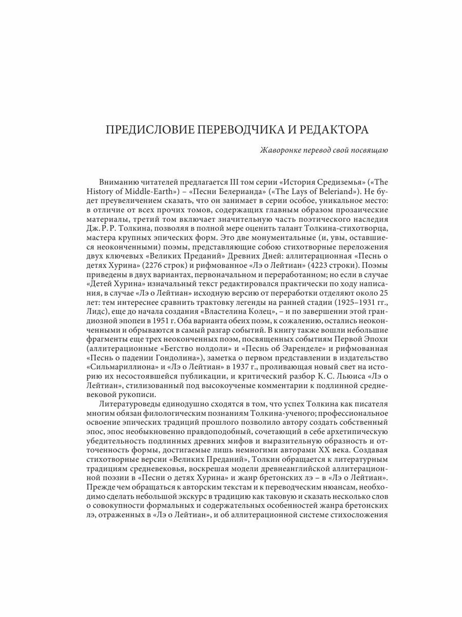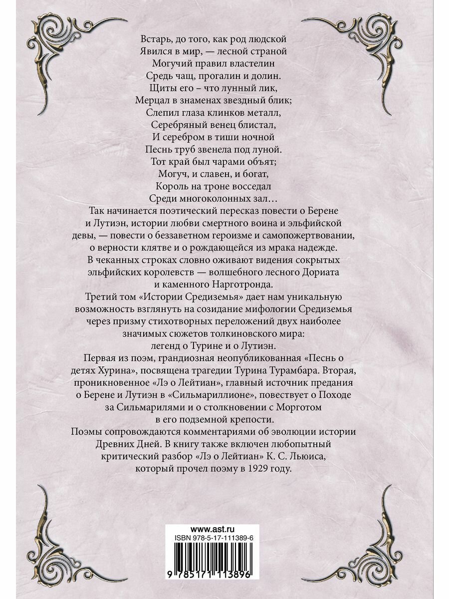 Третий том "Истории Средиземья" дает нам уникальную возможность взглянуть на созидание мифологии Средиземья через призму стихотворных переложений двух наиболее значимых сюжетов толкиновского мира: легенд о Турине и о Лутиэн. Первая из поэм, грандиозная неопубликованная "Песнь о детях Хурина", посвящена трагедии Турина Турамбара. Вторая, проникновенное "Лэ о Лейтиан", главный источник предания о Берене и Лутиэн в "Сильмариллионе", повествует о Походе за Сильмарилями и о столкновении с Морготом в его подземной крепости. Поэмы сопровождаются комментариями об эволюции истории Древних Дней. В книгу также включен любопытный критический разбор "Лэ о Лейтиан" К. С. Льюиса, который прочел поэму в 1929 году.