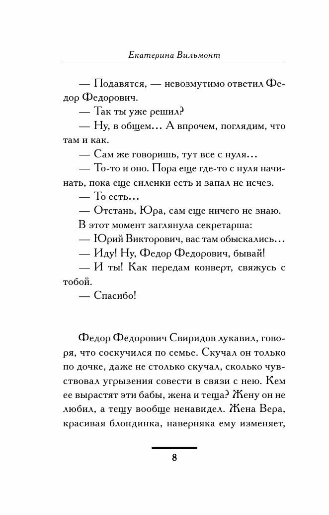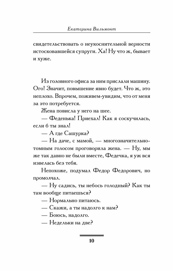 Каждый раз с огромным наслаждением погружаюсь в мир героев Екатерины Вильмонт. Это чтение для души и сердца, эмоциональное очищение от негатива, а вернее происходит его трансформация, преобразование в радость. Здесь присутствует юмор, ирония, лёгкость, вера и глубинное осознание благородства настоящих человеческих чувств! Величайшая благодарность автору! Здоровья и творческих успехов!!!