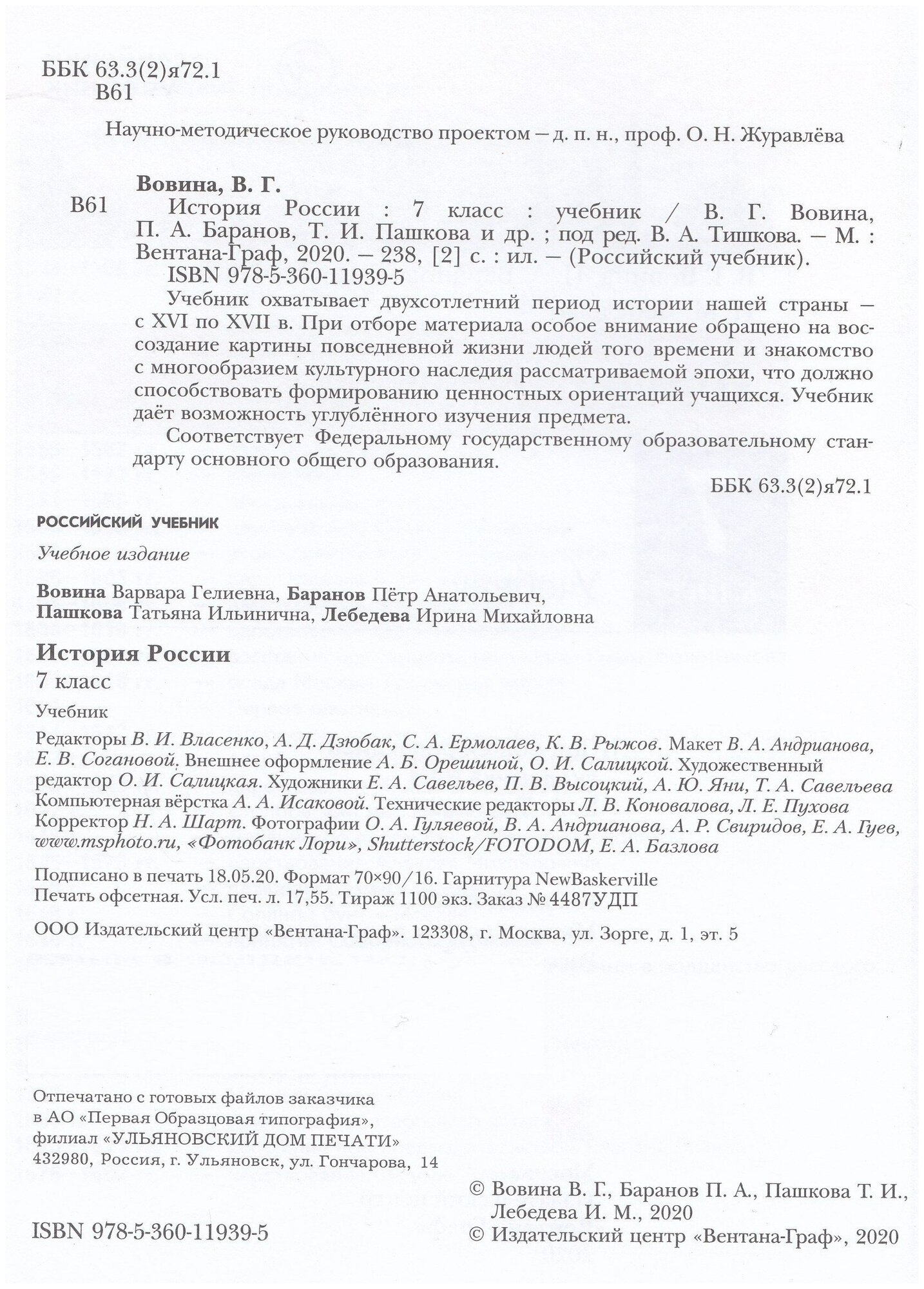 История России. 7 класс. Учебник (Вовина Варвара Гелиевна; Баранов Петр Анатольевич; Пашкова Татьяна Ильинична; Лебедева Ирина Михайловна); Просвещение/Вентана-Граф, 2019