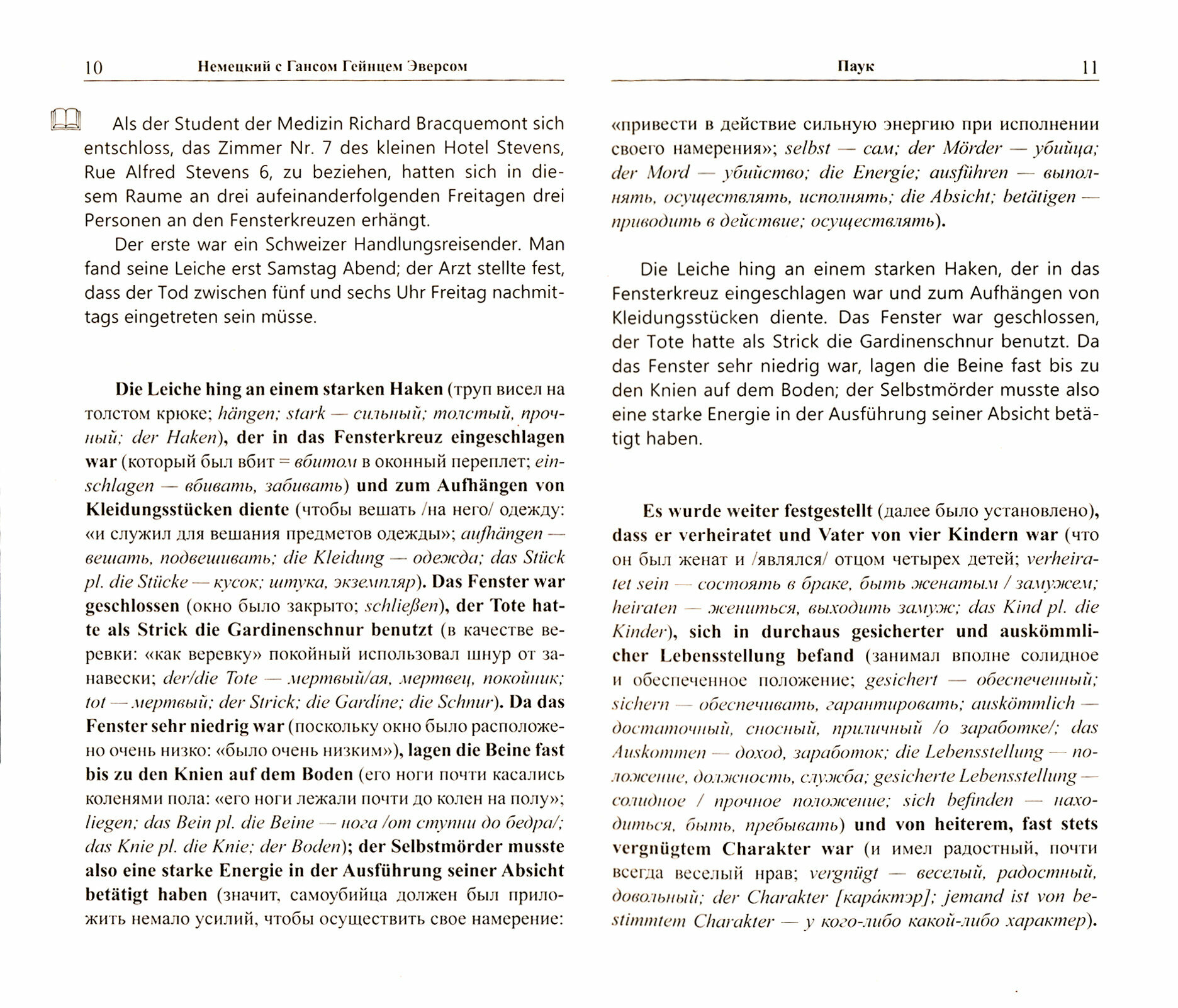 Метод Ильи Франка традиционен и уникален по-своему. Традиционен,- потому что продолжает лучшие традиции чтения по подстрочникам, Однако здесь ближе будет вариант Текста Билингвы. Уникален,- потому что текст грамотно разбит на смысловые абзацы, дается возможность прочитать небольшой отрывок сначала на языке оригинала,окунуться в стиль авторского изложения, прочувствовать слог, ритм фраз, правильность употребления оборотов и выражений, чередования клише. Затем перейти к помощнику, раскрывающему собственно говоря смысл фраз, оборотов и т.д. и уж затем прочитать вариант прочитанного ранее уже в стройной переводческой концепции. Метод позволяет убрать чьи-то домыслы, собственные фантазии даже там, где казало бы уже все известно в прочитанном. Кроме того методом пассивного необременительного заучивания приходит понимание и узнавание, а затем и воспроизведение словесных оборотов, клише, и т.п. Подключив работу с грамматикой, можно не только освоить язык, но и начать говорить, и самому строить фразы. Кроме того, Метод Ильи Франка позволяет познакомиться в оригинале с текстами, ставшими уже классикой, так и с теми авторами, перевод которых на русский язык вряд ли будет издан. Ганс Эверс и его "Паук" оригинально и достойно для знакомства. Формат книги обычен: темноватая газетная бумага, чередование нескольких шрифтов, с использованием выделений и курсивов. Рекомендую.