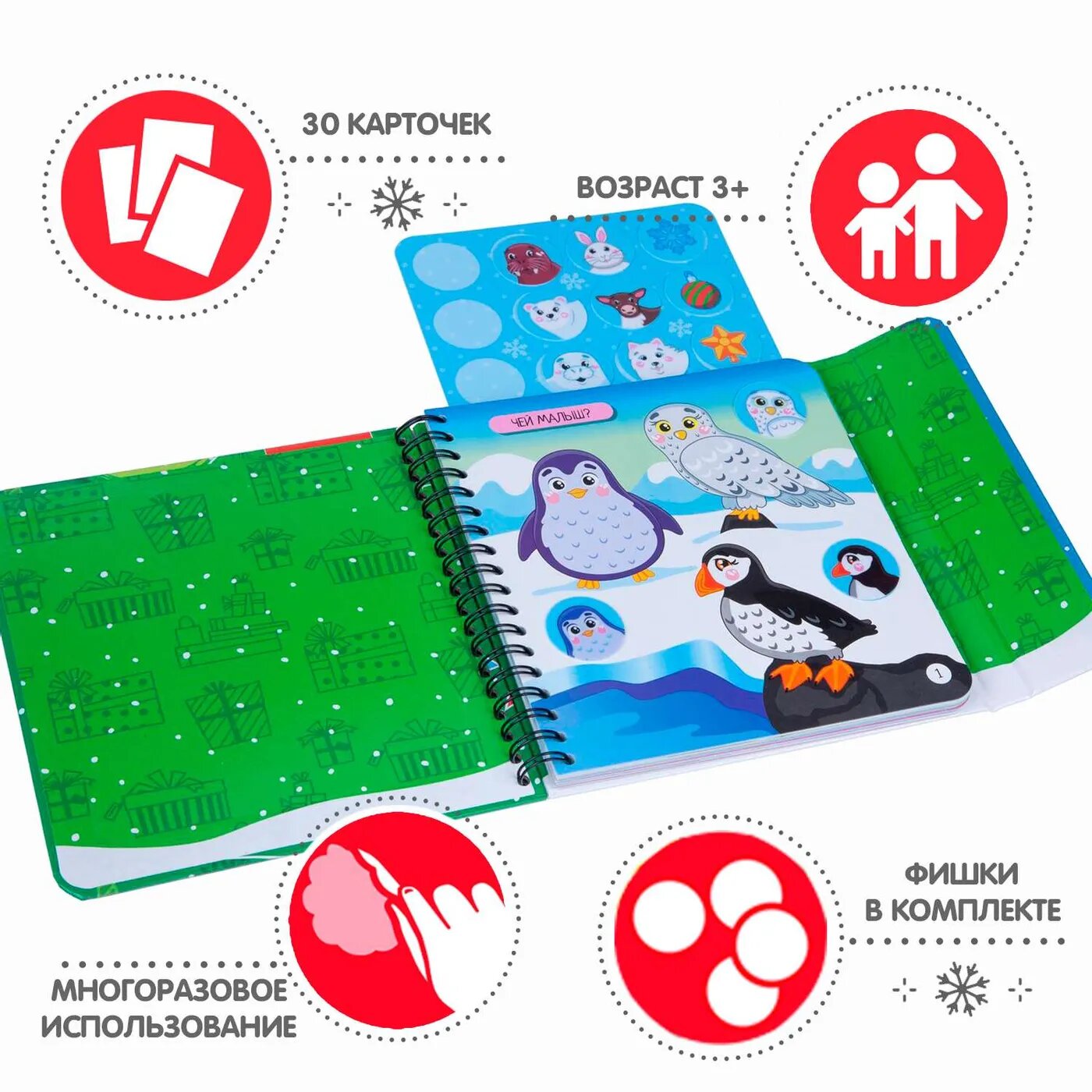 Вместе с замечательными мини-играми под ёлку от BONDIBON вы прекрасно проведете свой досуг в новогодние праздники! Красочные и интересные, они помогут провести время празднично и с пользой. Игры под ёлку СНЕЖНЫЙ МИР - это набор красочных познавательных заданий для малышей, рассказывающих о мире животных в увлекательной игровой форме. В комплект входит 12 фишек-стикеров с изображением детёнышей разных животных, ёлочных украшений и снежинки, а также 30 разнообразных заданий. Малыша обязательно увлечёт поиск подходящих фишек-стикеров к заданиям-вопросам: Чей малыш? Кто что ест? Чей домик?, а также к тематическим весёлым заданиям, ребусам, домино и загадкам. Прорезиненные фишки-стикеры не имеют магнитной или клеевой основы, но легко и надежно крепятся к игровому полю. Многоразовое использование фишек-стикеров поможет попробовать различные варианты, тренируя логику и смекалку малыша!
