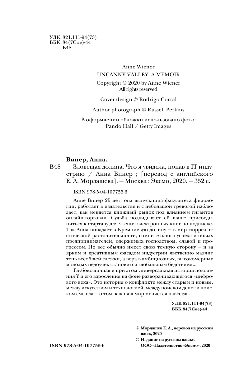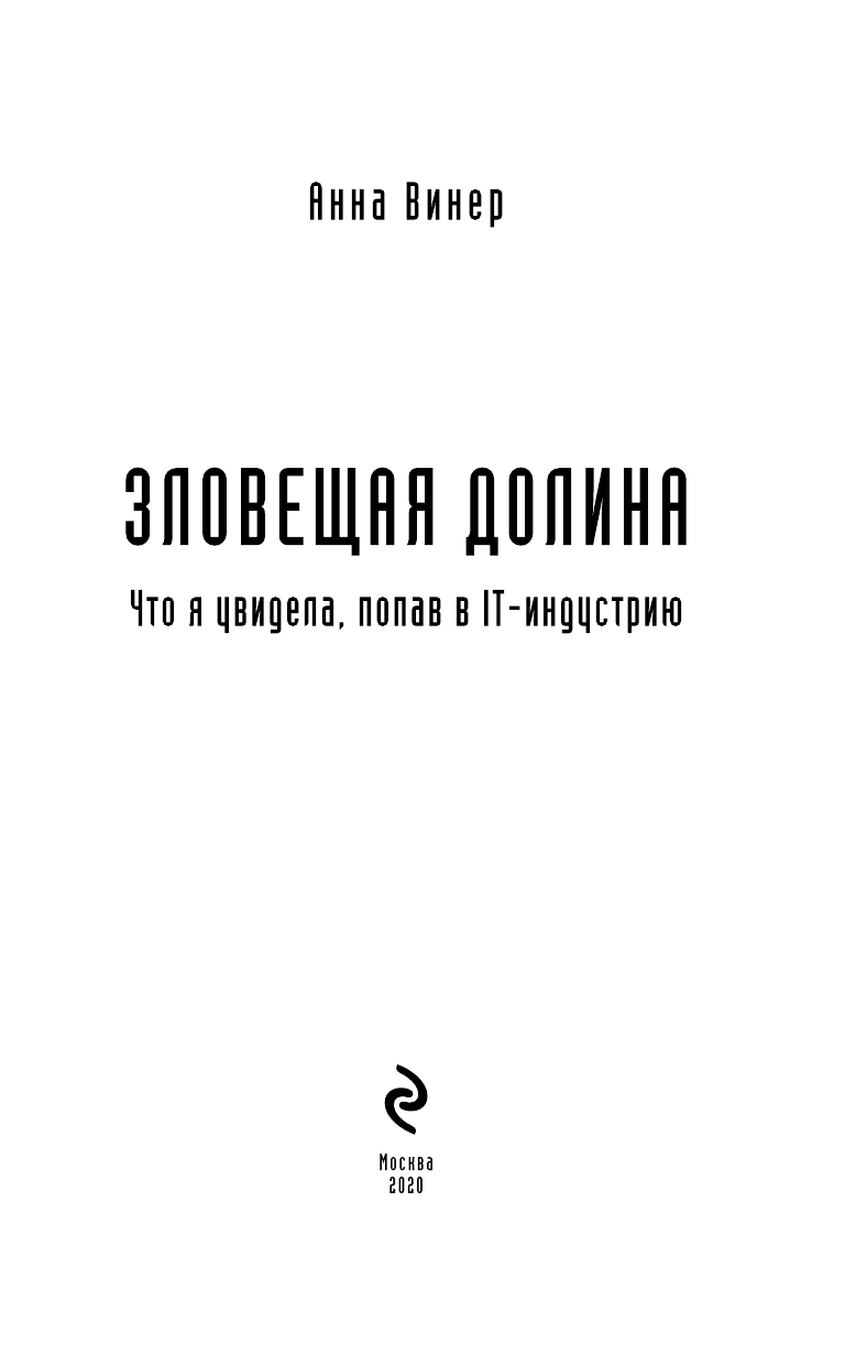 Зловещая долина. Что я увидела попав в IT-индустрию (Анна Винер); Эксмо, Редакция 1, 2020