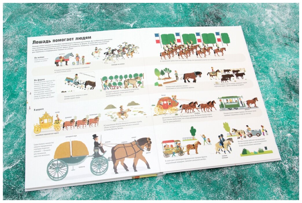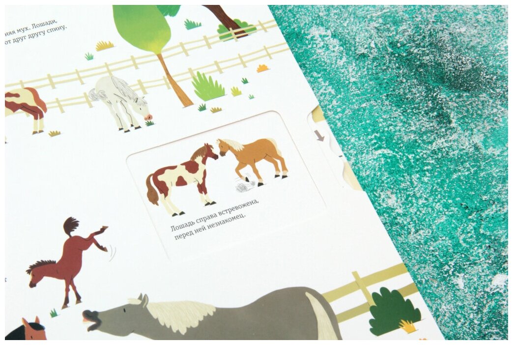 Книга просто отличная! Я достаточно долго сомневалась стоит ли покупать такую дорогую книгу для ребёнка 2,5 года. Но однозначно книга стоит своих денег - она понятная, интерактивная, красивая и содержит достаточно много информации. Дочка любит лошадок и она в восторге. Формат большой, листы картонные двойные с окошками, крутилками и двигалками. Иллюстрации яркие, качество печати прекрасное.
