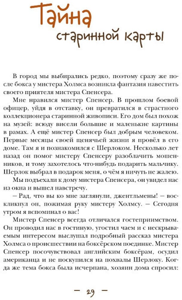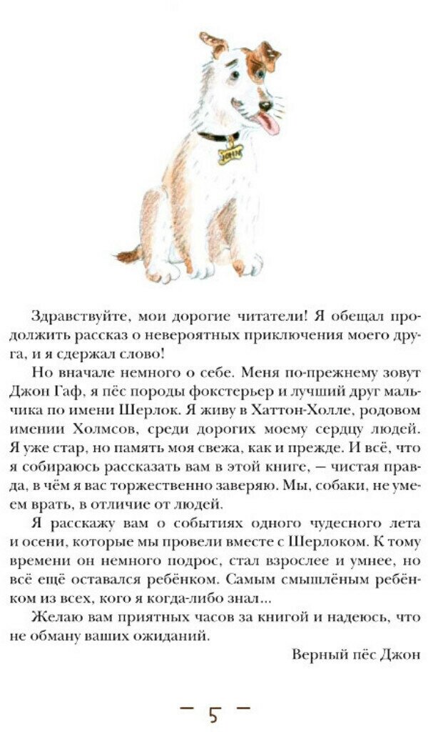 Джон Гаф, верный пёс мальчика по имени Шерлок Холмс (он станет знаменитым сыщиком, когда вырастет), продолжает рассказывать о приключениях своего юного друга. Вместе с Шерлоком и его верным псом вы попробуете разгадать тайну исчезновения английского джентльмена, поучаствуете в поисках пиратского клада и в ограблении банка, окажетесь на боксёрском поединке и собачьих бегах... А в конце книги вас ждут шарады - на этот раз из русских газет и журналов девятнадцатого века.