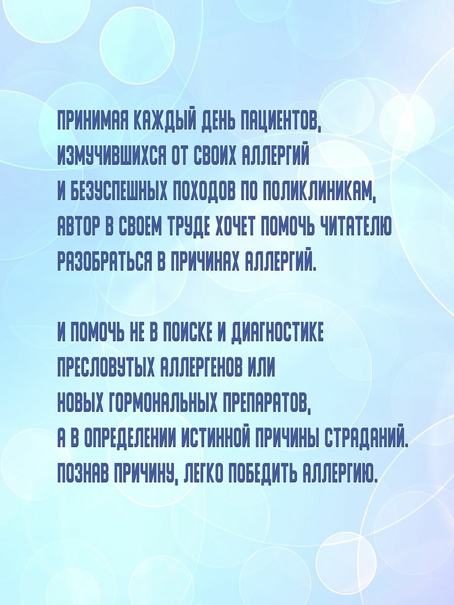 Дорогие читатели, после нескольких лет перерыва общения с вами опыт врача-практика вновь заставил меня взяться за перо. Принимая каждый день пациентов, измучившихся от своих аллергий и безуспешных походов по поликлиникам, я поняла, что не могу не писать. Я должна попытаться помочь вам разобраться в причинах ваших аллергий. И помочь вам не в поиске и диагностике пресловутых аллергенов или новых гормональных препаратов, а в определении истинной причины ваших страданий. Познав причину, легко победить аллергию.