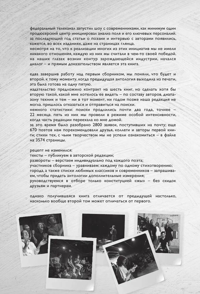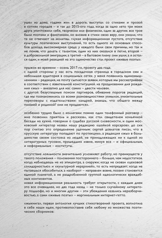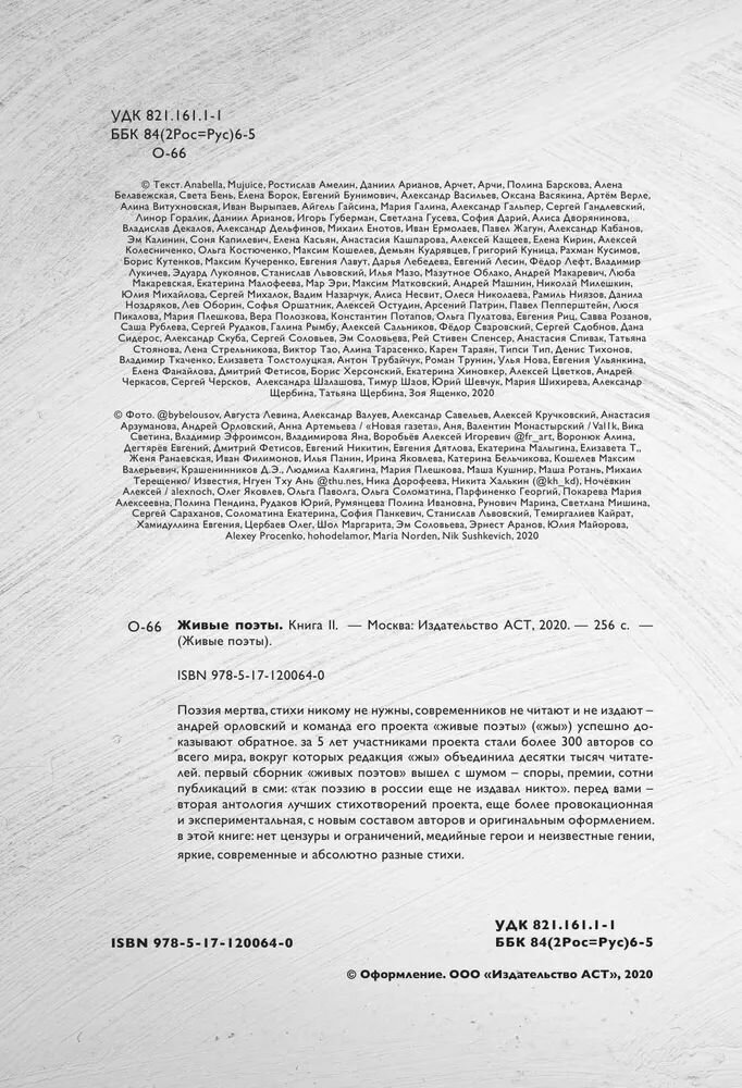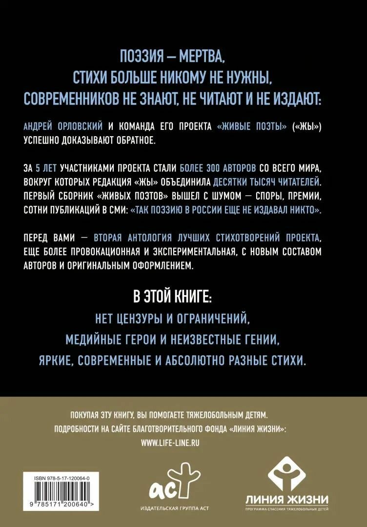 Поэзия мертва, стихи никому не нужны, современников не читают и не издают - Андрей Орловский и команда его проекта "Живые поэты" ("ЖЫ") успешно доказывают обратное. За 5 лет участниками проекта стали более 300 авторов со всего мира, вокруг которых редакция "ЖЫ" объединила десятки тысяч читателей. Первый сборник "живых поэтов" вышел с шумом - споры, премии, сотни публикаций в СМИ: "Так поэзию в России еще не издавал никто". Перед вами - вторая антология лучших стихотворений проекта, еще более провокационная и экспериментальная, с новым составом авторов и оригинальным оформлением. В этой книге: нет цензуры и ограничений, медийные герои и неизвестные гении, яркие, современные и абсолютно разные стихи.