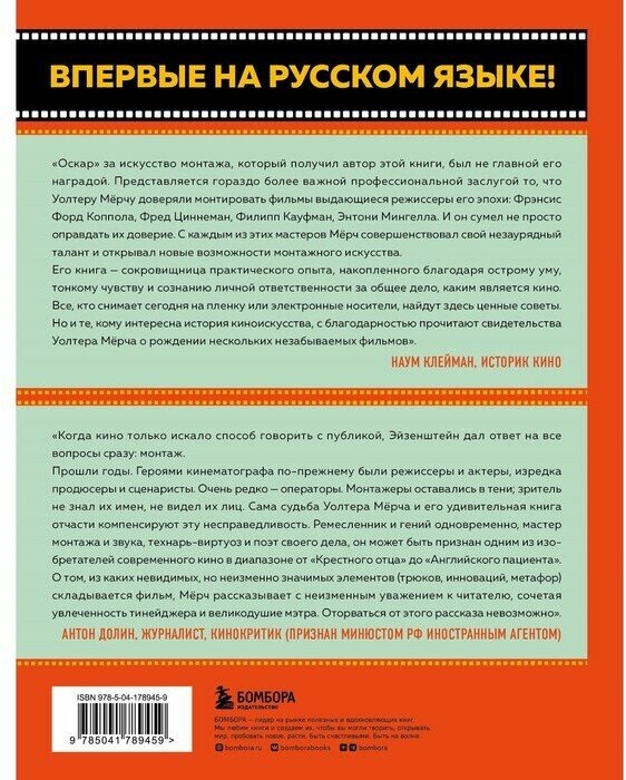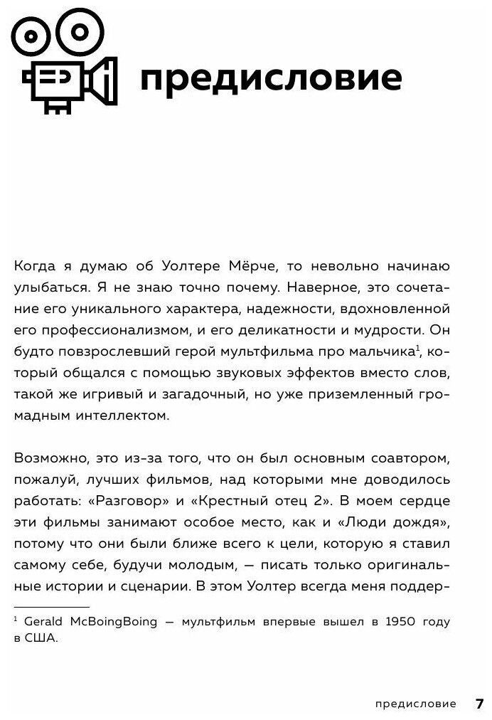 Великолепная книга от великолепного Уолтера Мёрча! Это бог монтажа в киноиндустрии! Если вы хоть немного интересуетесь монтажом, то встречали эту книгу под названием In the blink of an eye во всех рекомендуемых списках. Книге уже много лет, и я не ожидала, что её таки издадут на русском! Воу)) Особенно порадовало, что Мёрч специально переписал часть глав (по моим наблюдениям тут треть книги дописана и обновлена) и даже русское предисловие сделал. Круто, вот бы на презентации ещё его увидить в России)) В лучшие времена, конечно.