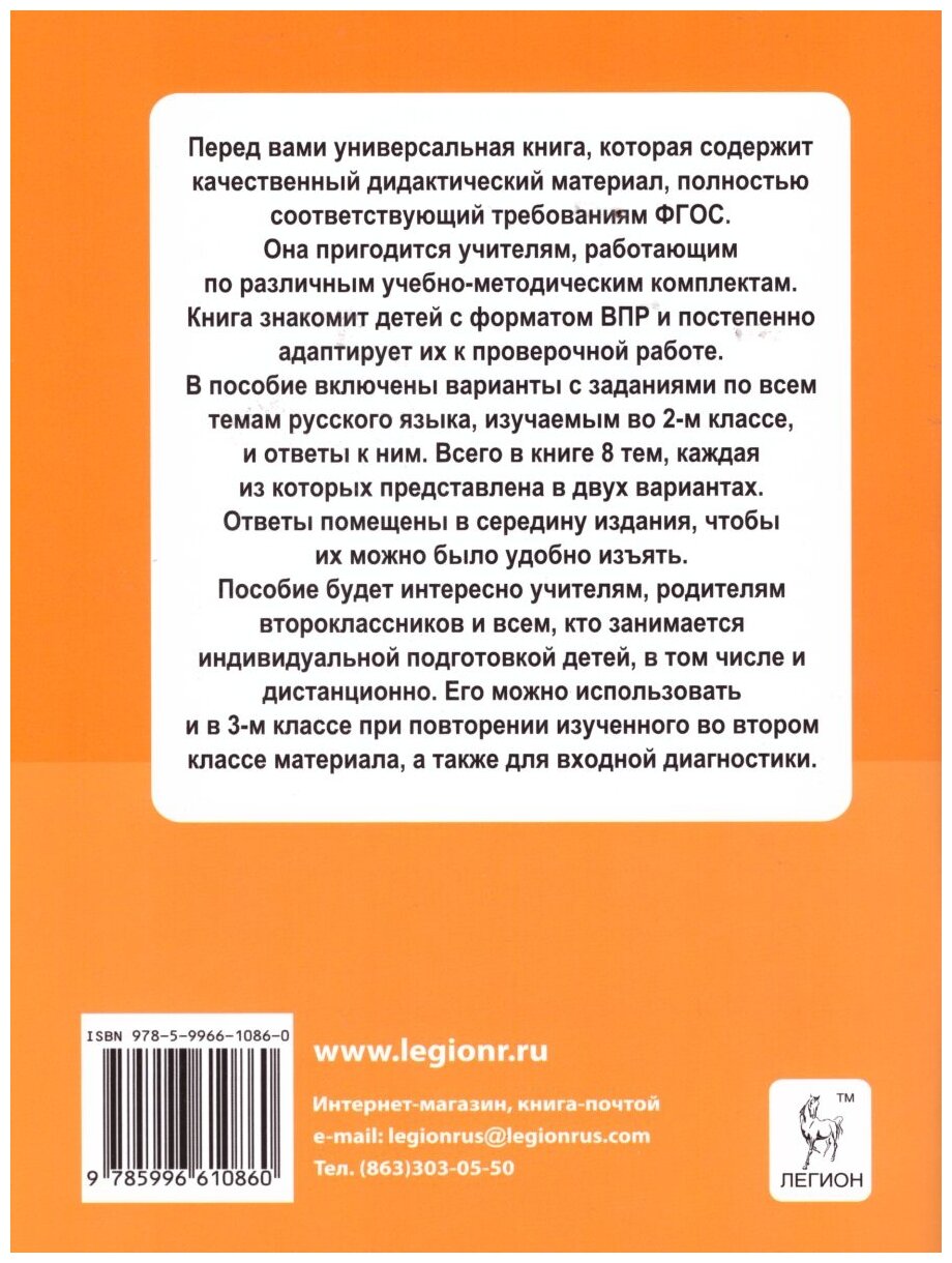 В пособие включены варианты с заданиями по всем темам русского языка, изучаемым во 2-м классе, и ответы к ним. Всего в книге 8 тем, каждая из которых представлена в двух вариантах. Ответы помещены в середину издания, чтобы их можно было удобно изъять.