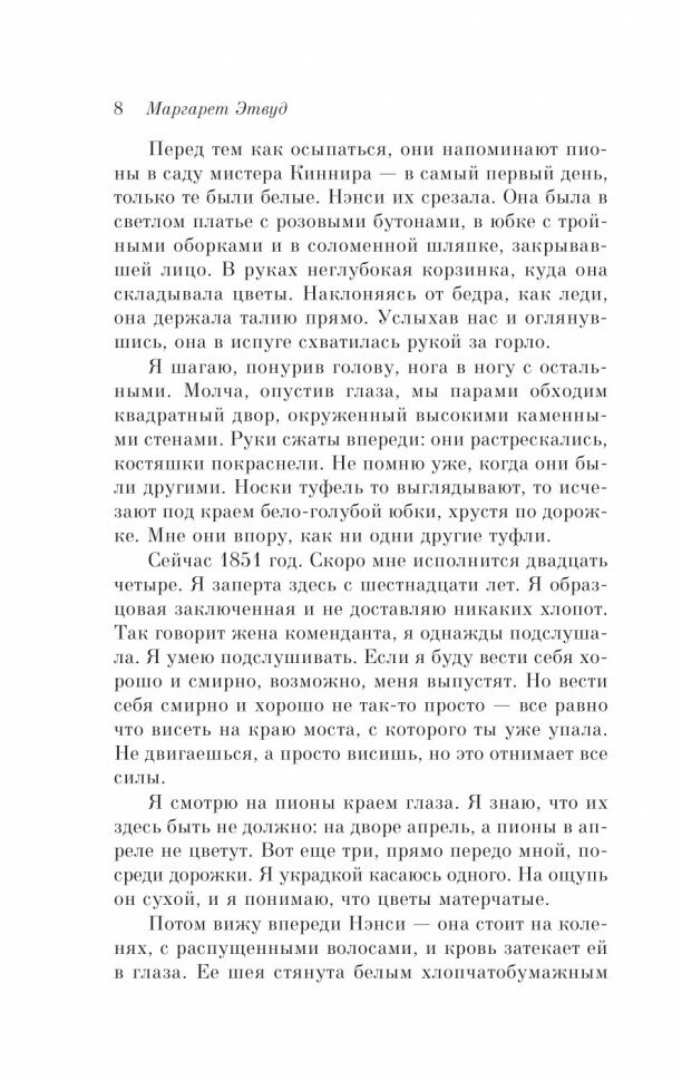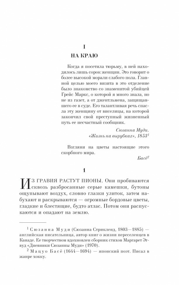 Не могу сказать, что данная книга произвела какое-то неизгладимое впечатление. На мой взгляд, чего-то в ней все-таки не хватает. М. Этвуд берет за основу историю Грейс Маркс, обвиненной в соучастии в жестоком убийстве своего хозяина и экономки. На момент совершения убийства Грейс было 16 лет, и ее осудили пожизненно. Приводятся рисунки, изображающие главных подозреваемых, и исторические факты, описывающие данное преступление. И Этвуд рассказывает историю девушки, чьи годы проходят в тюремной...