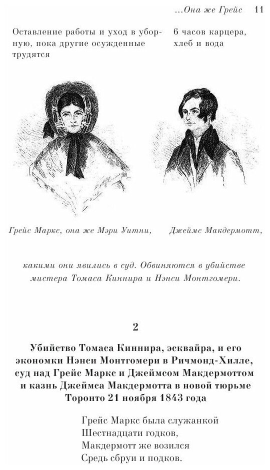 В 16 лет служанка Грейс Маркс была обвинена в убийстве своего хозяина мистера Киннира и его экономки и любовницы Нэнси Монтгомери. Убийство Киннира — Монтгомери произошло 23 июля 1843 года в городке Ричмонд-Хилл недалеко от Торонто. В ноябре Грейс предстала перед судом вместе со своим предполагаемым сообщником и любовником Джеймсом Макдермоттом. Его признали виновным и повесили, её изначальный смертный приговор был смягчён до пожизненного заключения. В 1872 году Грейс Маркс была помилована и...