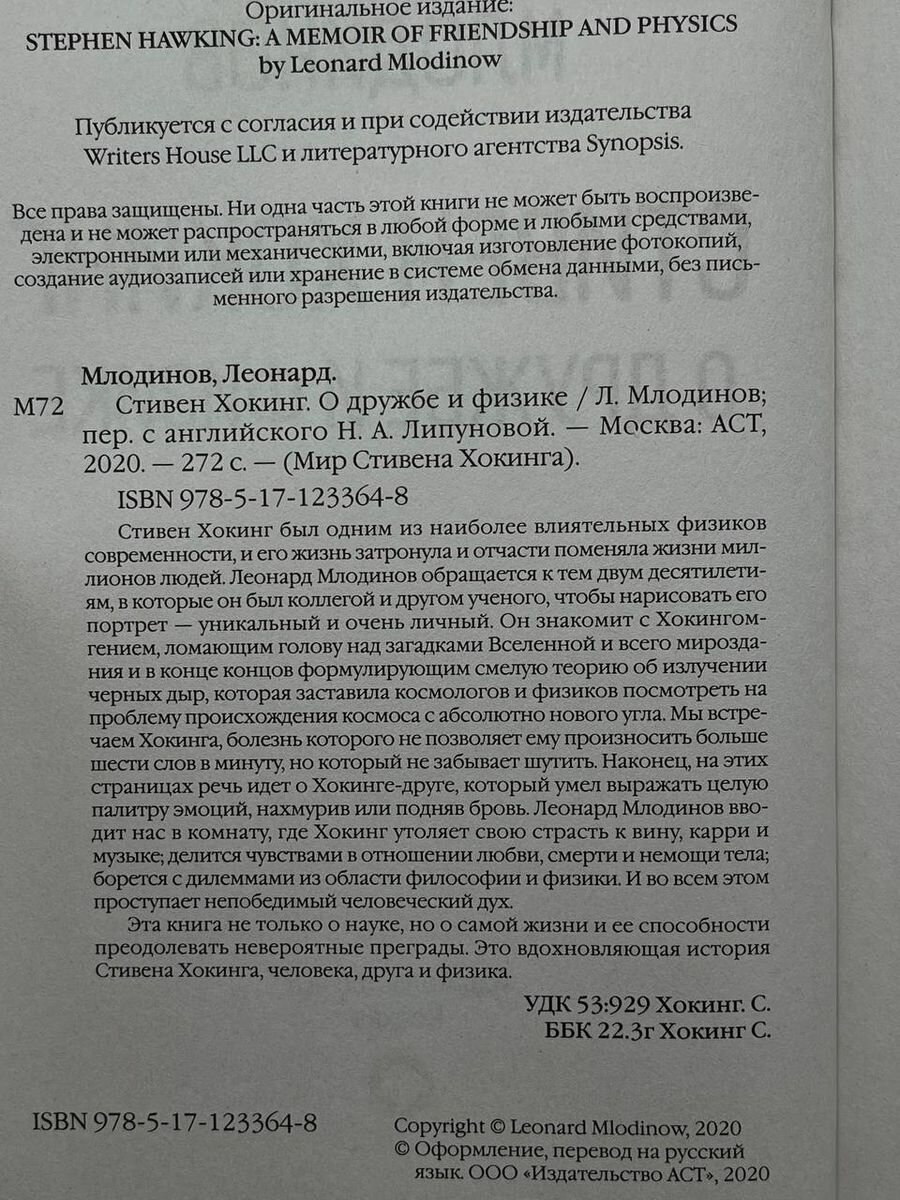 Стивен Хокинг был одним из наиболее влиятельных физиков современности, и его жизнь затронула и отчасти поменяла жизни миллионов людей. Леонард Млодинов обращается к тем двум десятилетиям, в которые он был коллегой и другом ученого, чтобы нарисовать его портрет — уникальный и очень личный. Он знакомит с Хокингом-гением, ломающим голову над загадками Вселенной и всего мироздания и в конце концов формулирующим смелую теорию об излучении черных дыр, которая заставила космологов и физиков посмотреть на проблему происхождения космоса с абсолютно нового угла. Мы встречаем Хокинга, болезнь которого не позволяет ему произносить больше шести слов в минуту, но который не забывает шутить. Наконец, на этих страницах речь идет о Хокинге-друге, который умел выражать целую палитру эмоций, нахмурив или подняв бровь. Леонард Млодинов вводит нас в комнату, где Хокинг утоляет свою страсть к вину, карри и музыке; делится чувствами в отношении любви, смерти и немощи тела; борется с дилеммами из области философии и физики. И во всем этом проступает непобедимый человеческий дух.