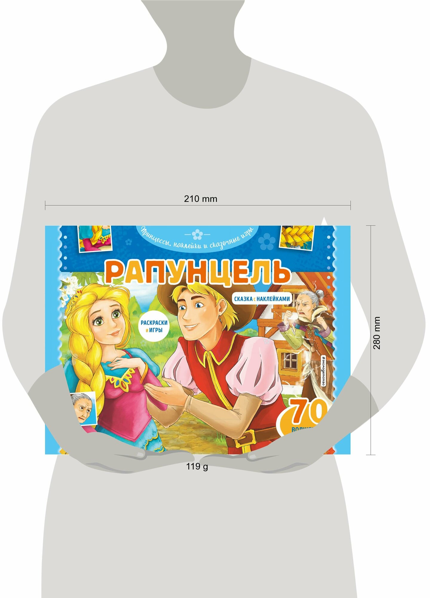 Присоединяйтесь к героям любимой сказки и отправляйтесь волшебную страну Рапунцель. В книге целых 70 наклеек, которыми нужно дополнить замечательные иллюстрации, 10 больших картинок для раскрашивания, много заданий и квиз на знание истории длинноволосой красавицы. Совершите невероятное приключение и весело проведите время вместе с земачательными персонажами и старой доброй историей.