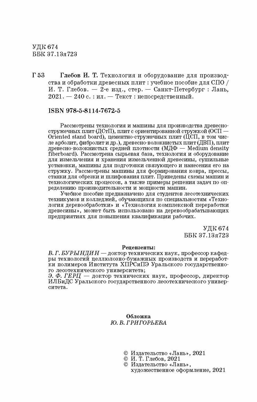 Технология и оборуд.д/пр-ва и обраб.древ.плит.СПО (И. Т. Глебов); Издательство ЛАНЬ, 2020