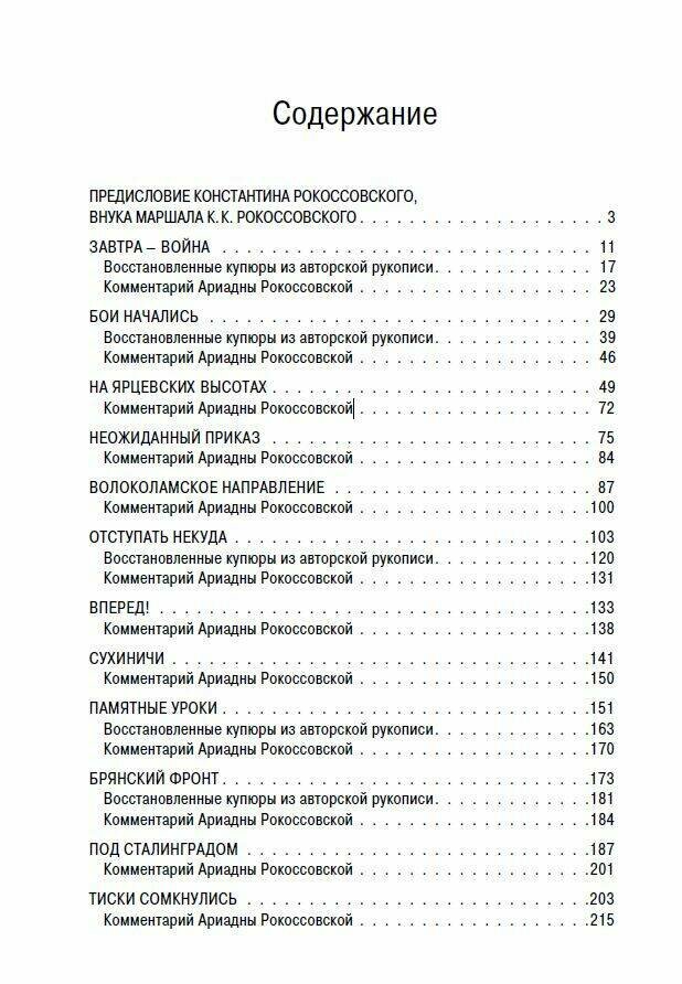 Воспоминания маршала К.К. Рокоссовского публикуются вместе с восстановленными купюрами из авторской рукописи, изъятыми советской цензурой, а также дополнены письмами и фотографиями из семейного архива и комментариями К.В. Рокоссовского, внука, и А.К. Рокоссовской, правнучки прославленного маршала Победы.