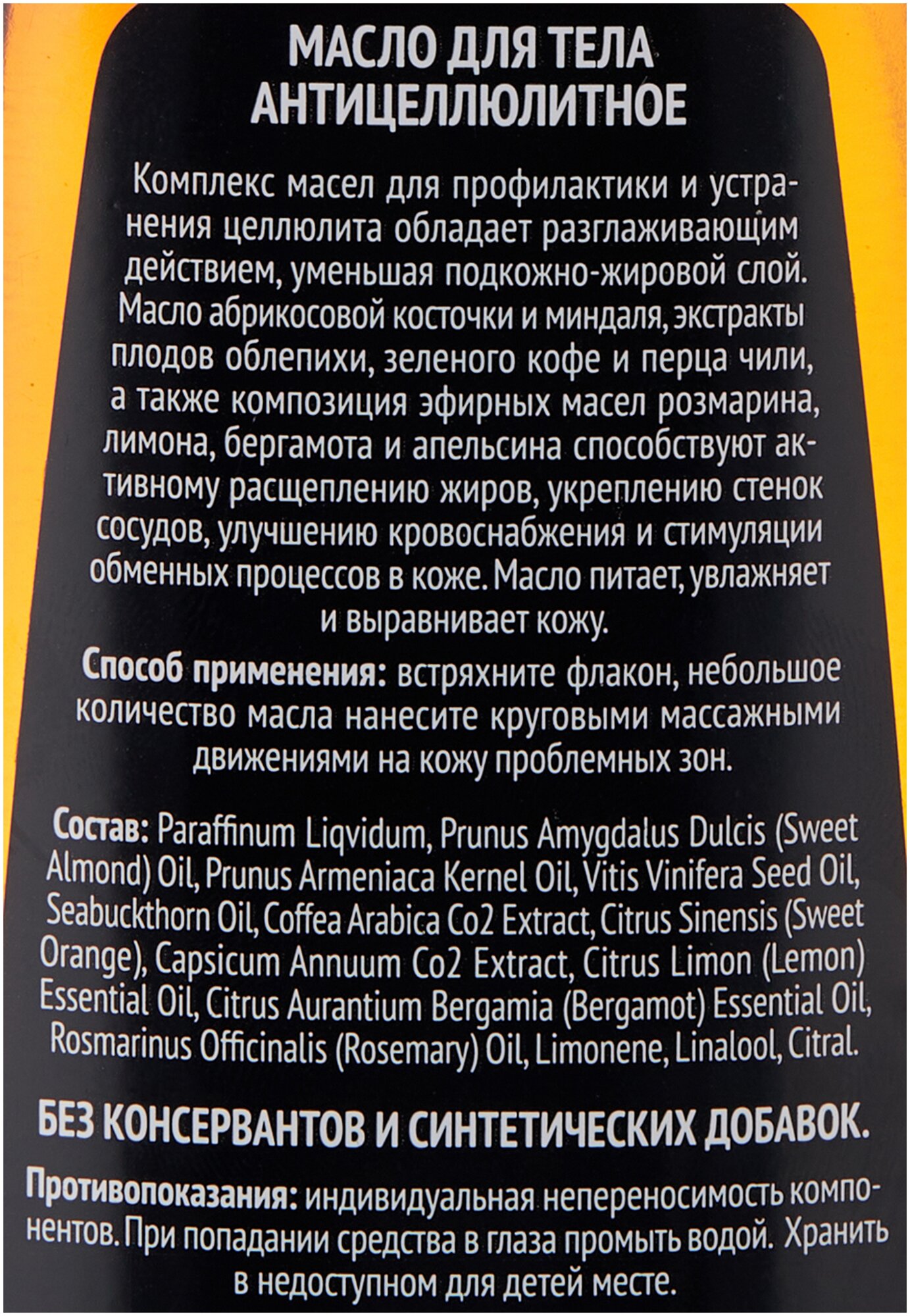Комплекс масел для профилактики и устранения целлюлита обладает разглаживающим действием, уменьшая подкожно-жировой слой. Масло абрикосовой косточки и миндаля, экстракты плодов облепихи, зеленого кофе и перца чили, а также композиция эфирных масел розмарина, лимона, бергамота и апельсина способствуют активному расщеплению жиров, укреплению стенок сосудов, улучшению кровоснабжения и стимуляции обменных процессов. Масло питает, увлажняет и выравнивает кожу. Назначение: для интенсивного разглаживания, увлажнения и питания кожи, в качестве регулярного ухаживающего и массажного масла. Способ применения: встряхните флакон, небольшое количество масла нанесите круговыми массажными движениями на кожу проблемных зон. #массажное масло для тела антицеллюлитное #антицеллюлитное масло #масло для тела #антицеллюлитное масло для массажа #масло массажное антицеллюлитное
