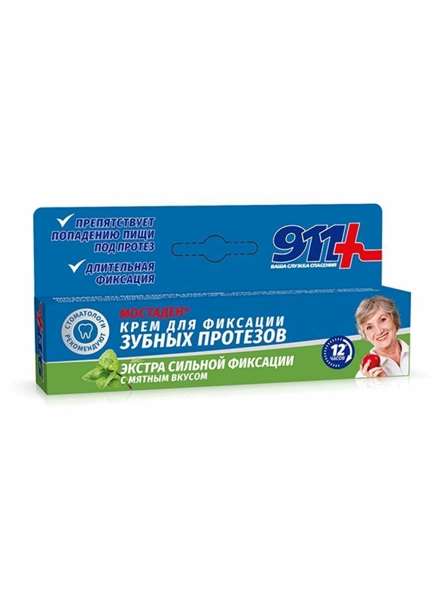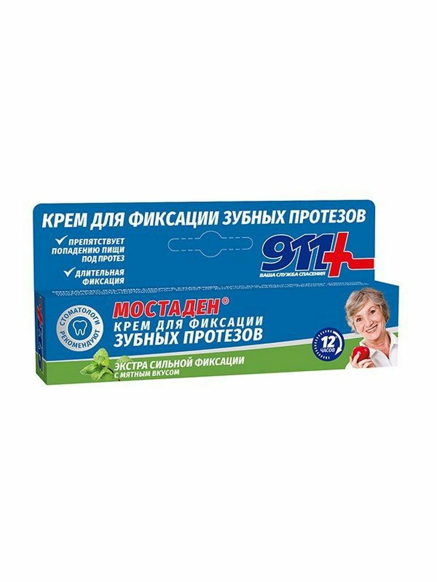 Форма выпуска Крем для фиксации зубных протезов - 40 мл, туба в уп.Состав Mineral Oil, Petrolatum, Calcium/Sodium PVM/MA Copolymer, Cellulose Gum, Mentha Arvensis Herb Oil, Menthyl Lactate, Limonene, Linalool.Описание МОСТАДЕН® 911 ваша служба спасения - крем для фиксации зубных протезов экстра сильной фиксации с мятным вкусом способствует надежной фиксации, предотвращая повреждение десен, не допускает смещения протеза, попадания под него частичек пищи. Легко наносится, сохраняет свои свойства под воздействием горячей и холодной пищи, не меняет вкус еды и напитков, не оказывает негативного воздействия на желудок. Не смывается слюной и равномерно распределяется по всей прилагающей к десне поверхности. Наносится на влажные протезы. • Без красителей и вкусовых добавок; • Сильная и длительная фиксация зубных протезов (не менее 12 часов); • Рекомендуется при повышенном слюноотделении; • Препятствует проникновению пищи под протез; • Не влияет на вкус пищи и напитков; • Удобен и экономичен в употреблении.Показания для фиксации зубных протезовПротивопоказания Индивидуальная непереносимость компонентов продукта. При появлении каких-либо раздражений или аллергических реакций немедленно прекратить использование.Способ применения и дозы Нанести крем короткими полосками не слишком близко к краям зубного протеза, Надеть протез, предварительно прополоскав рот, Плотно сжать челюсти на 5-20 секунд, излишки крема убрать салфеткой.
