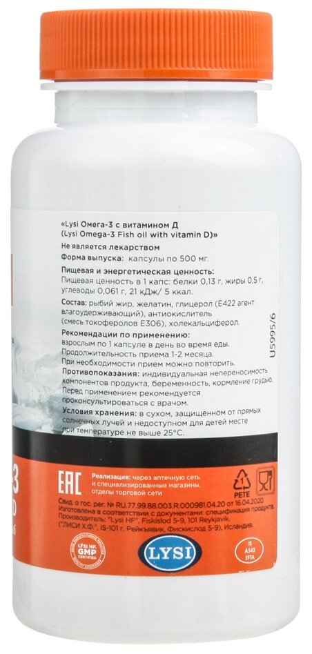 Lysi Omega-3 с витамином D содержит омега-3 жирные кислоты, оказывающие положительное влияние на работу сердца. Витамин D3 способствует укреплению мышц и костной ткани, поддерживает иммунитет. Не содержит лактозу, глютен, дрожжей.
