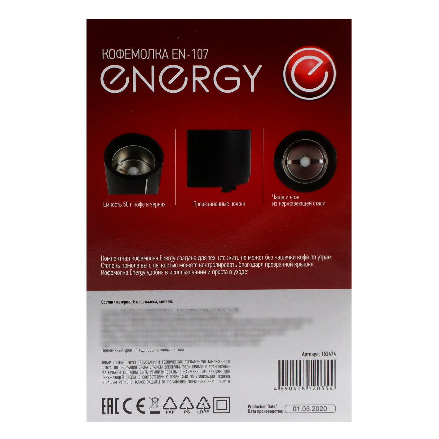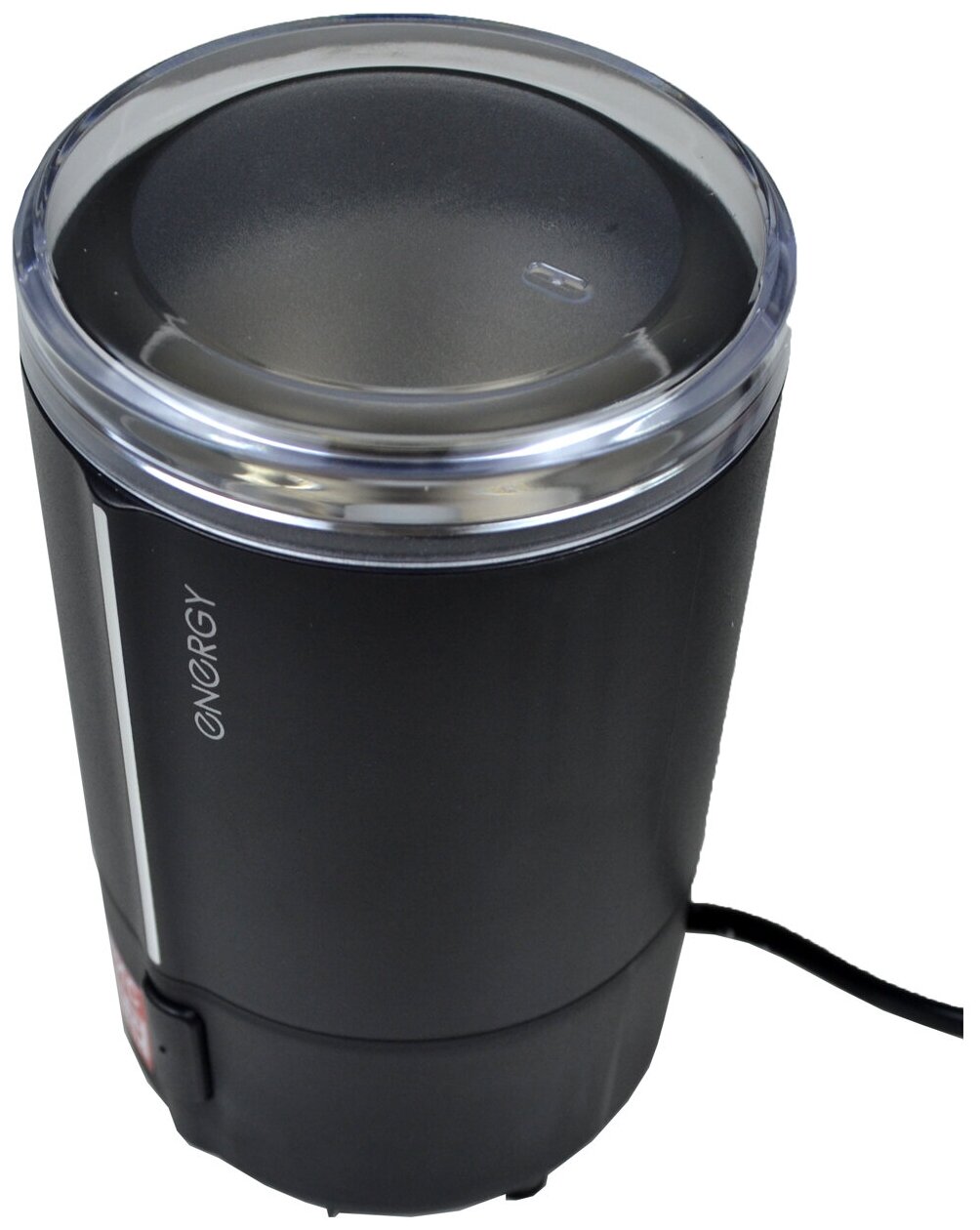 | Прочие особенности и свойства | Стильная электрическая кофемолка Energy EN-107 обладает приятным, современным дизайном и небольшими размерами, благодаря чему станет настоящим украшением вашей кухни.,,Прибор оборудован надежным мотором мощностью 150 Вт и оснащен ножом с острыми лезвиями из высококачественной нержавеющей стали, что позволяет сделать процесс помола кофейных зерен быстрым и легким.,,Прозрачная крышка позволит наблюдать за процессом, контролируя степень помола. Удобная система включения/выключения при нажатии на кнопку обеспечивает максимально комфортное использование кофемолки. Защита от непроизвольного включения гарантирует высокую степень безопасности. |