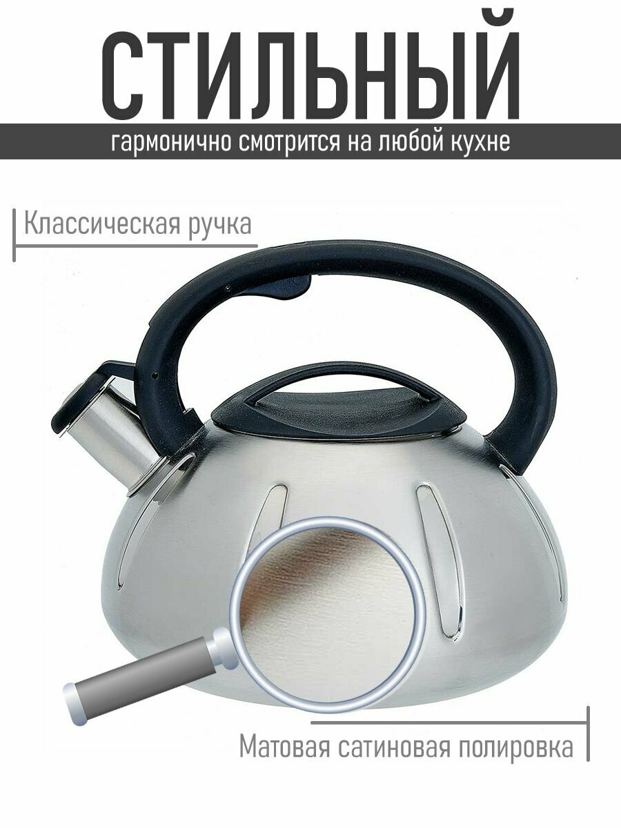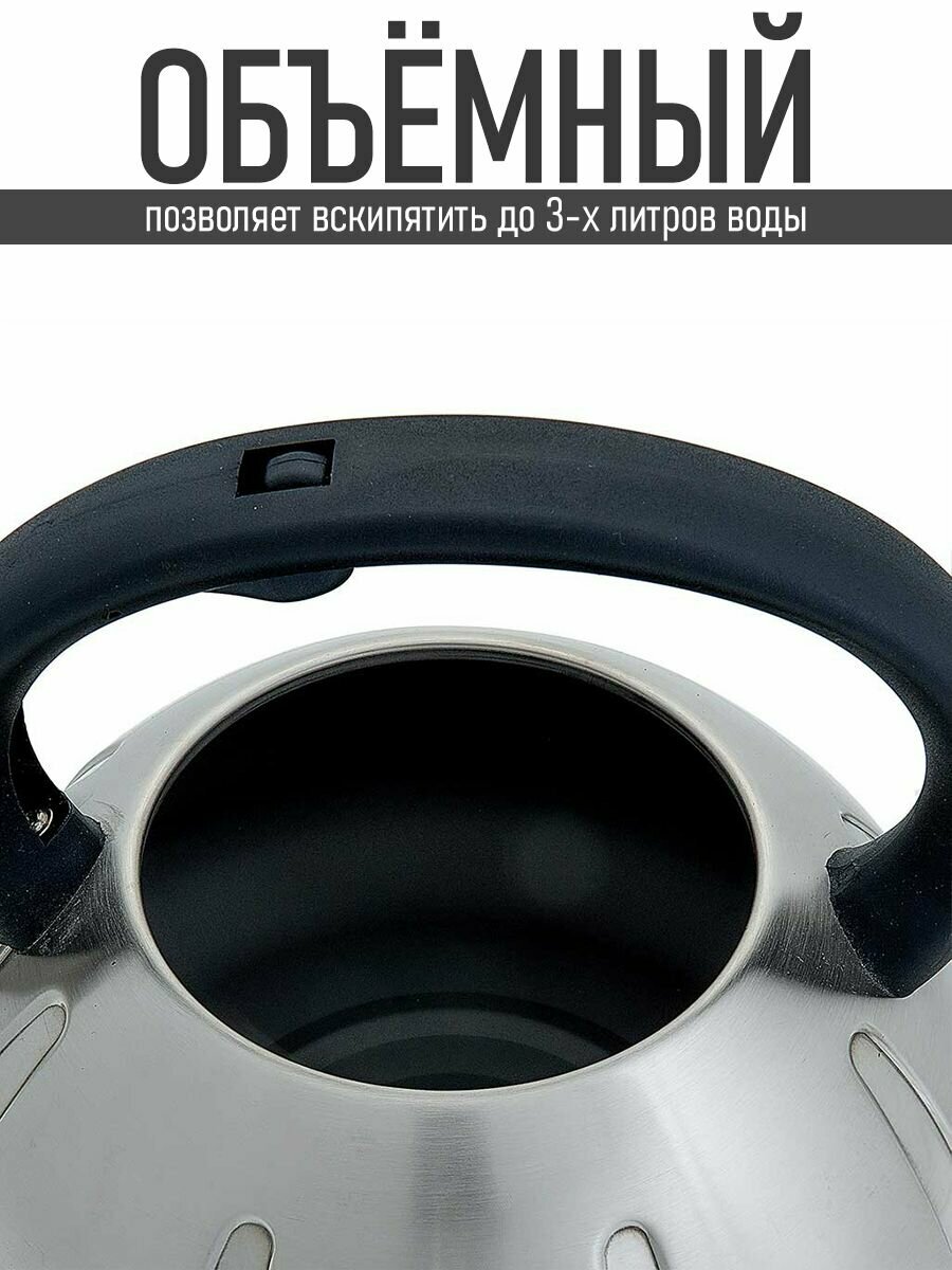 Объем 3 литра.Толщина стенок 0,6 мм.Высококачественная нержавеющая сталь.Сатиновая полировка.Нейлоновая ручка с кнопкой открывания носика.Цвет ручки и крышки: черный.Цельнолитое индукционное дно.Пригоден для использования на всех типах кухонных плит, включая индукционные.