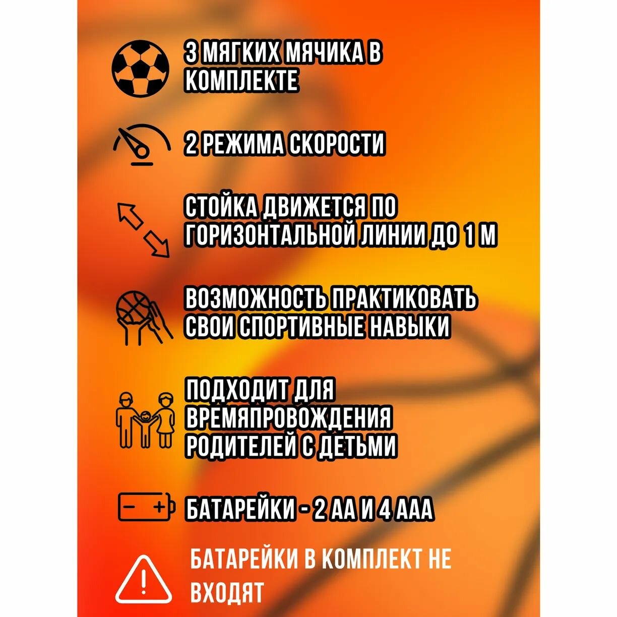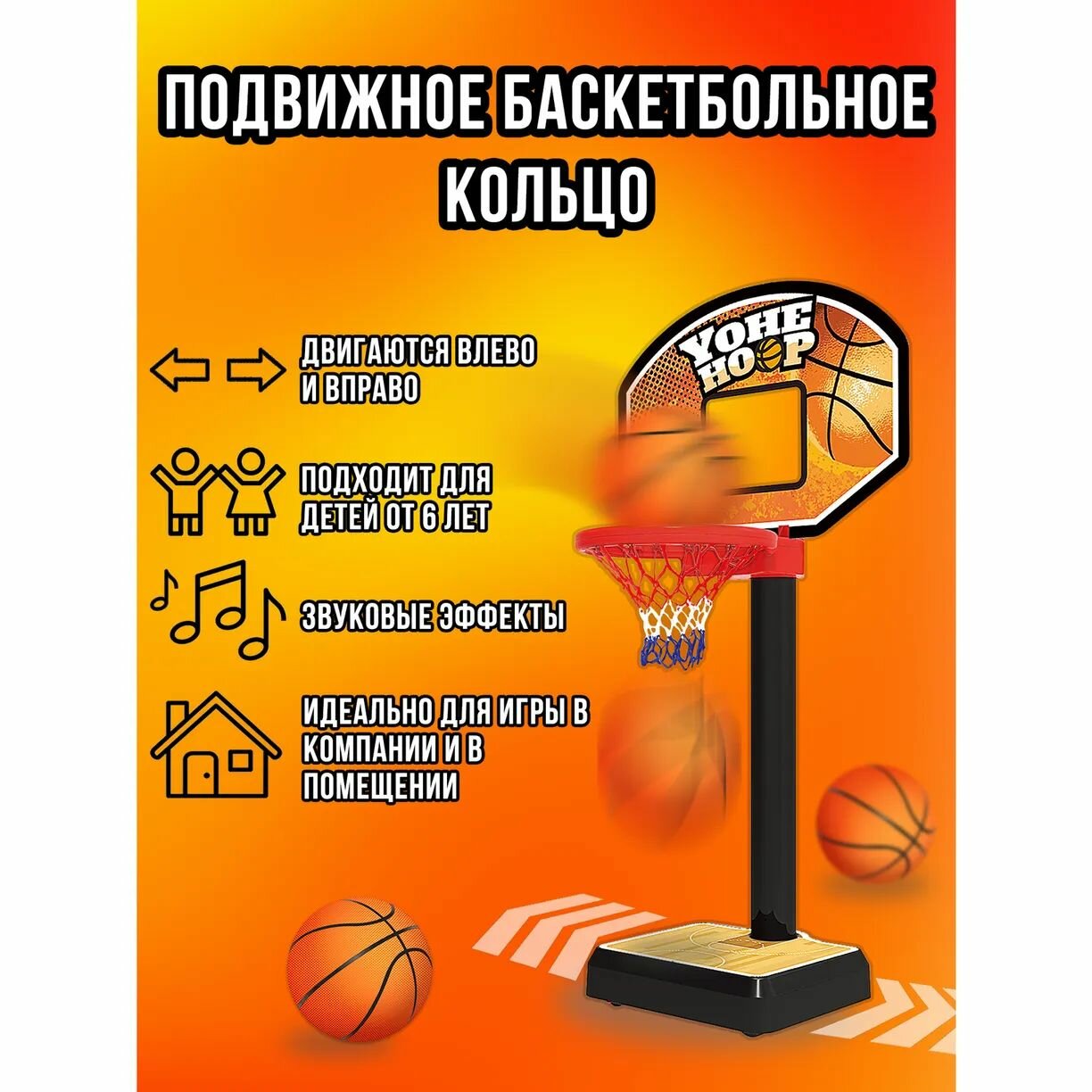 Спортивное снаряжение для игры "Баскетбол" с корзиной на стойке и тремя мячами. Во время игры стойка движется по горизонтальной линии до 1 метра, при этом может меняться скорость (2 режима). При попадании в корзину мяча активируются звуковые эффекты. Отлично подходит для игры в помещении. Замечательная возможность практиковать свои спортивные навыки с друзьями и весело провести время. Размер игрушки 22х21х71 см, размер мяча 7х7 см. Внимание. Для работы игрушки необходимы 2 батарейки ААА и 4 батарейки АА, не входят в комплект.