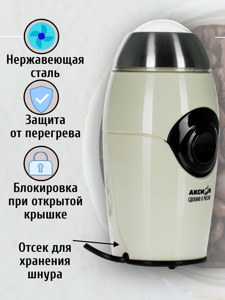Быстро и без хлопот смолоть кофе для приготовления ароматного и насыщенного напитка вам поможет простая и удобная кофемолка Аксион КМ-22. Она оснащена внутренней чашей из нержавеющей стали, вмещающей 50 г кофейных зерен, и острым ножом из нержавеющей стали, который, вращаясь с большой скоростью, перемалывает зерна кофе. Измельчение до нужной консистенции достигается простым нажатием на крышку кофемолки. Благодаря прозрачной крышке, вы сможете наблюдать за процессом перемалывания.