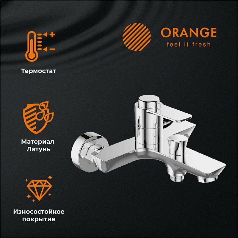 Orange T19-944cr. Душевая система в комплекте: однозахватный смеситель для ванны с термостатом; верхний душ d265 мм с ситемой самоочистки, ручной душ 120 мм с режимом самоочистки, регулируемый по высоте и наклону держатель, душевой шланг 1,5 м, керамический дивертор. Штанга с возможностью установки в старые отверстия, цвет: хром