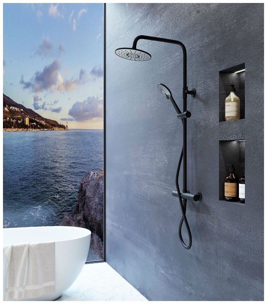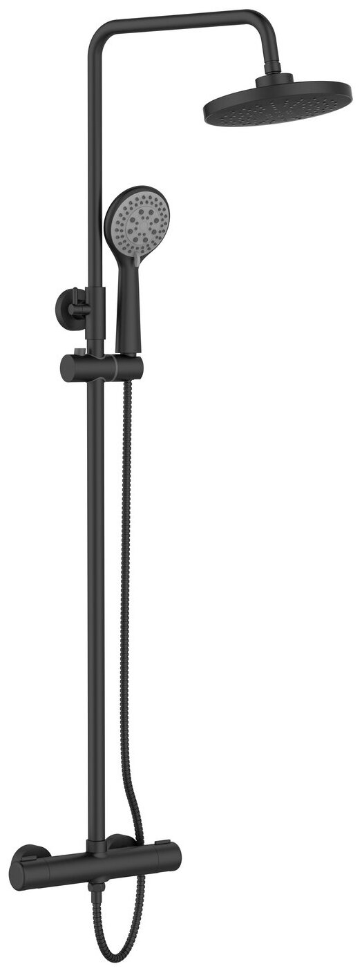 Orange T02S3-912b Душевая система c термостатом черного цвета в комплекте: смеситель с термостатом без излива, телескопическая штанга, двухрежимный верхний душ 200 мм с регулируемым углом наклона и силиконовыми наконечниками, многофункциональный ручной душ, регулируемый по высоте держатель; шланг 1500 мм в металлической оплетке.
